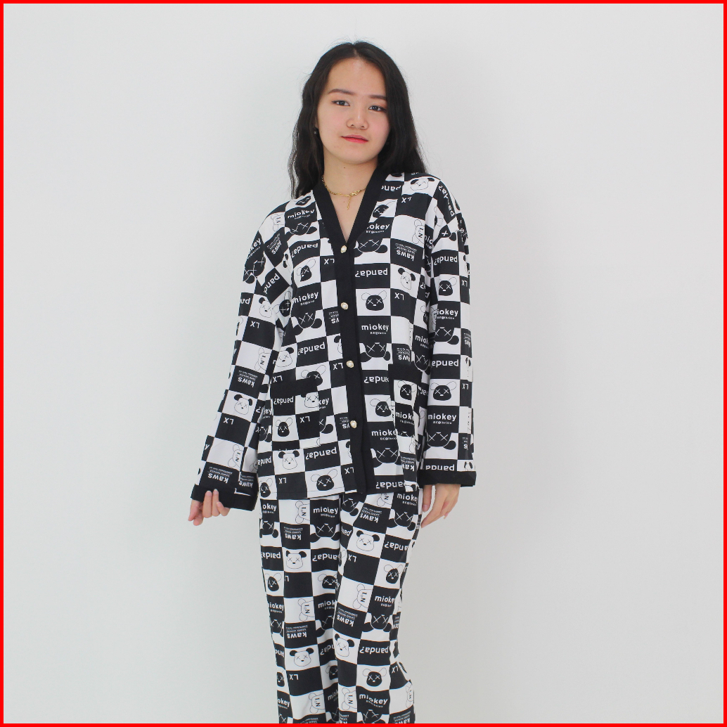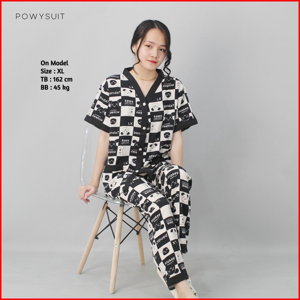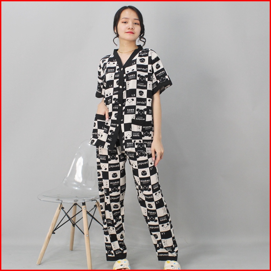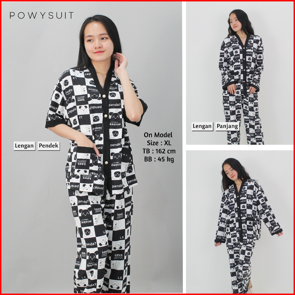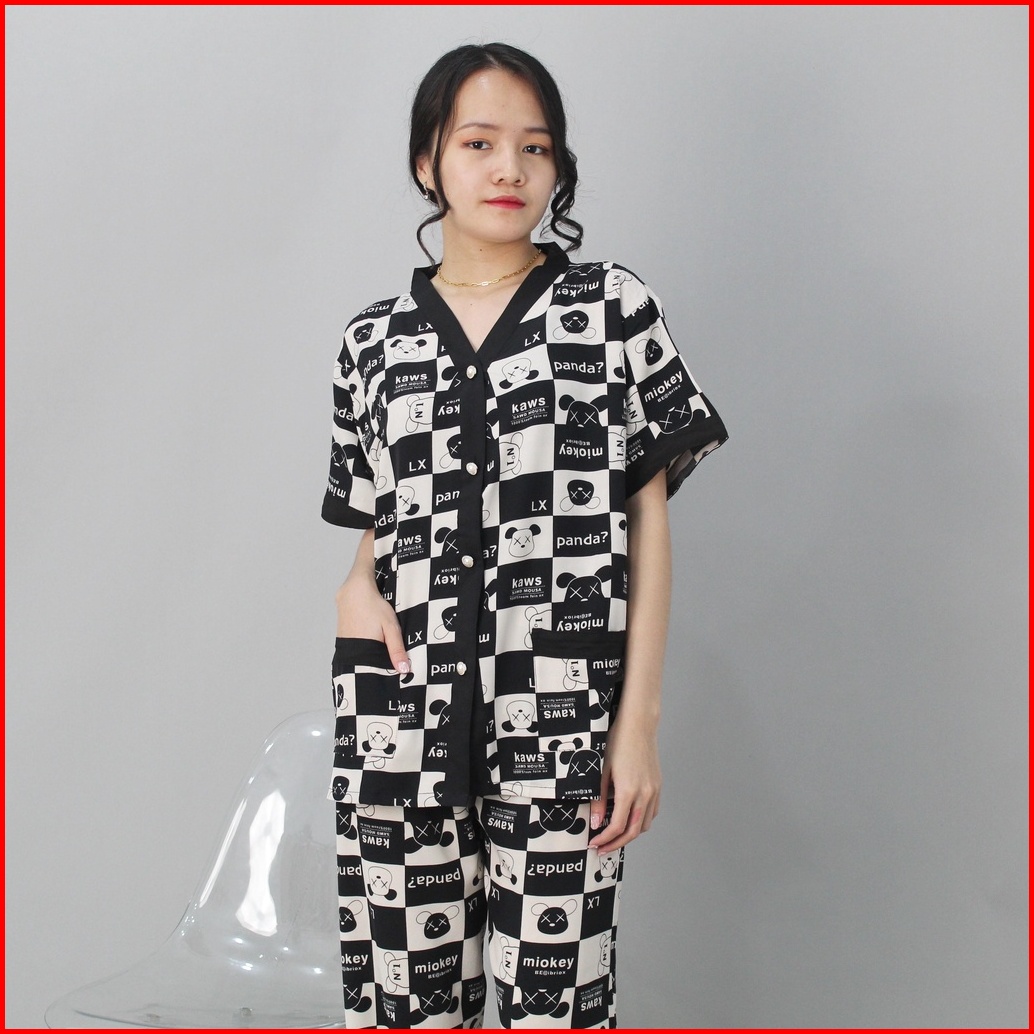 Piyama Motif Kaws Panda Miokey Bahan Satin Lengan Pendek Celana Panjang Baju Tidur Wanita Dewasa Lembut