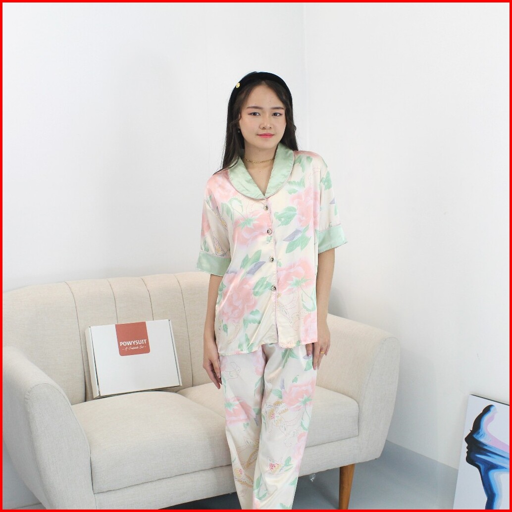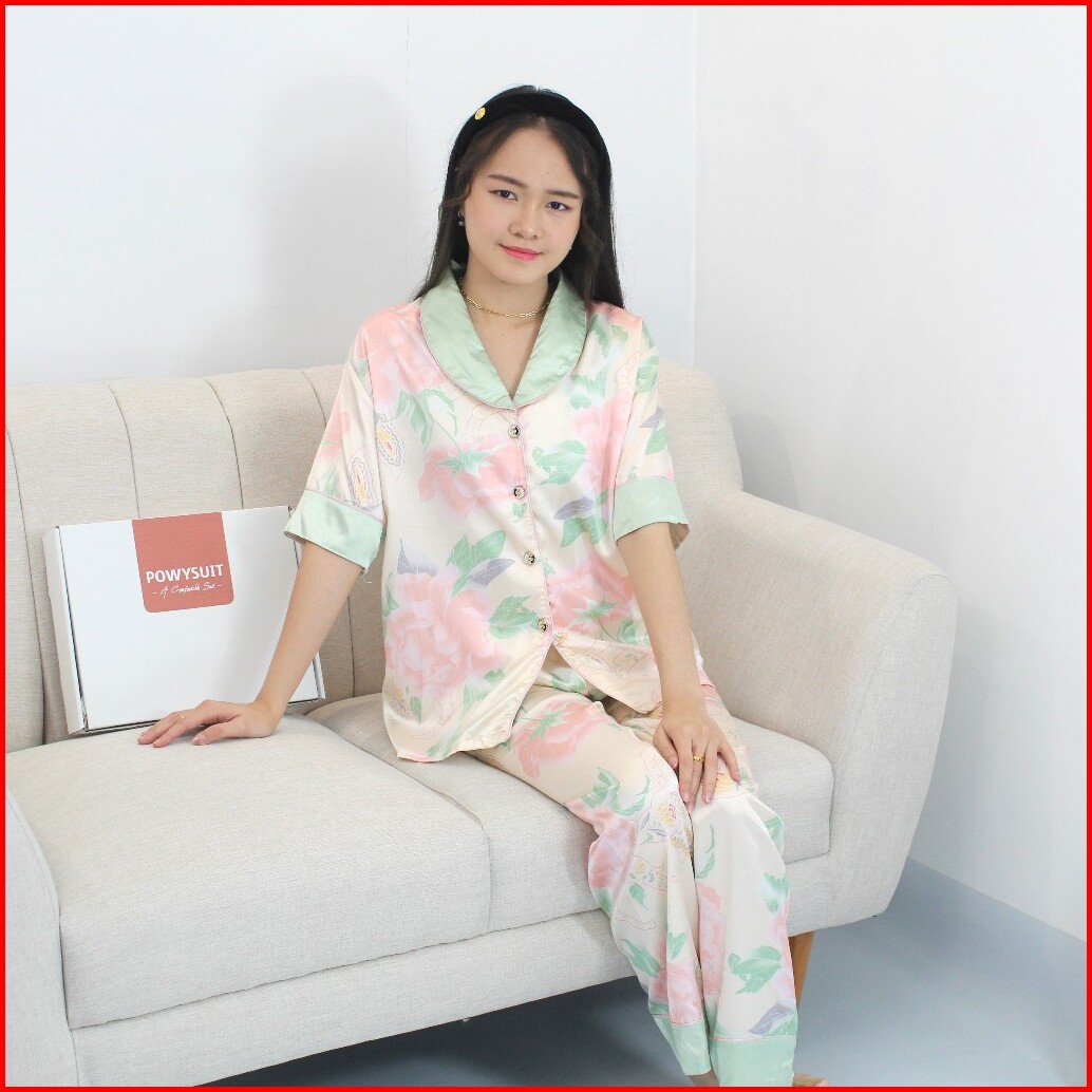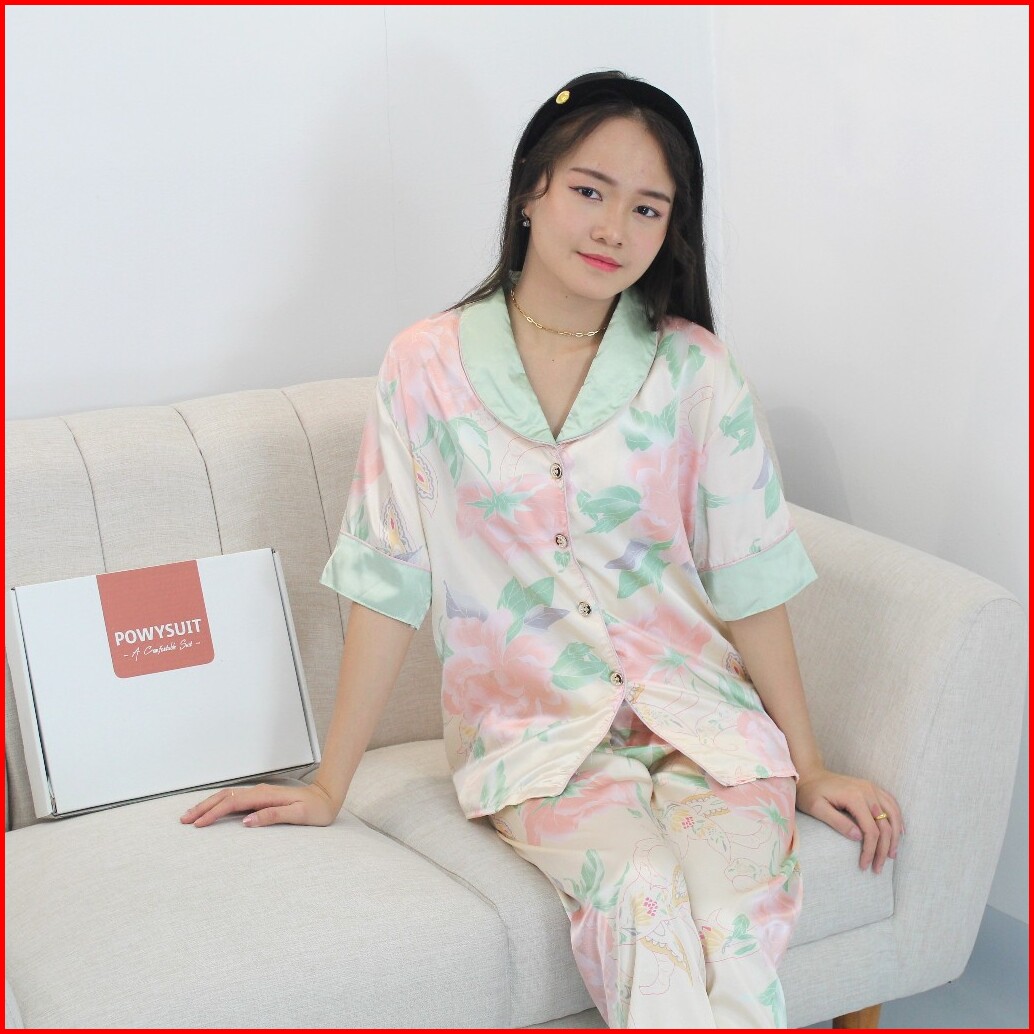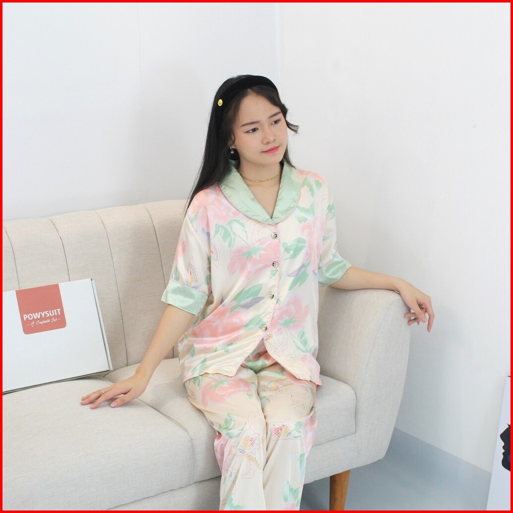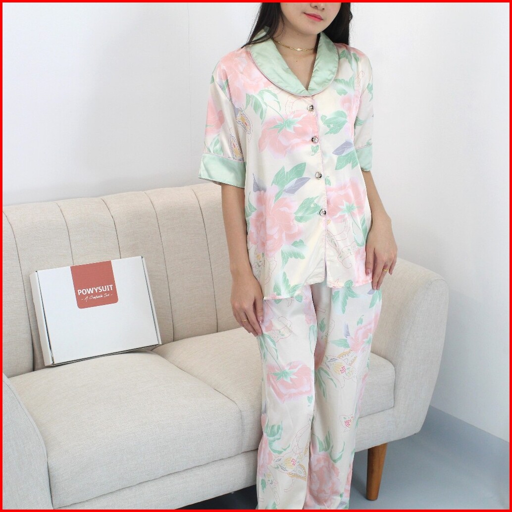 St34 Bunga Piyama Satin Kancing Powysuit Baju Tidur Wanita Lengan Pendek Celana Panjang