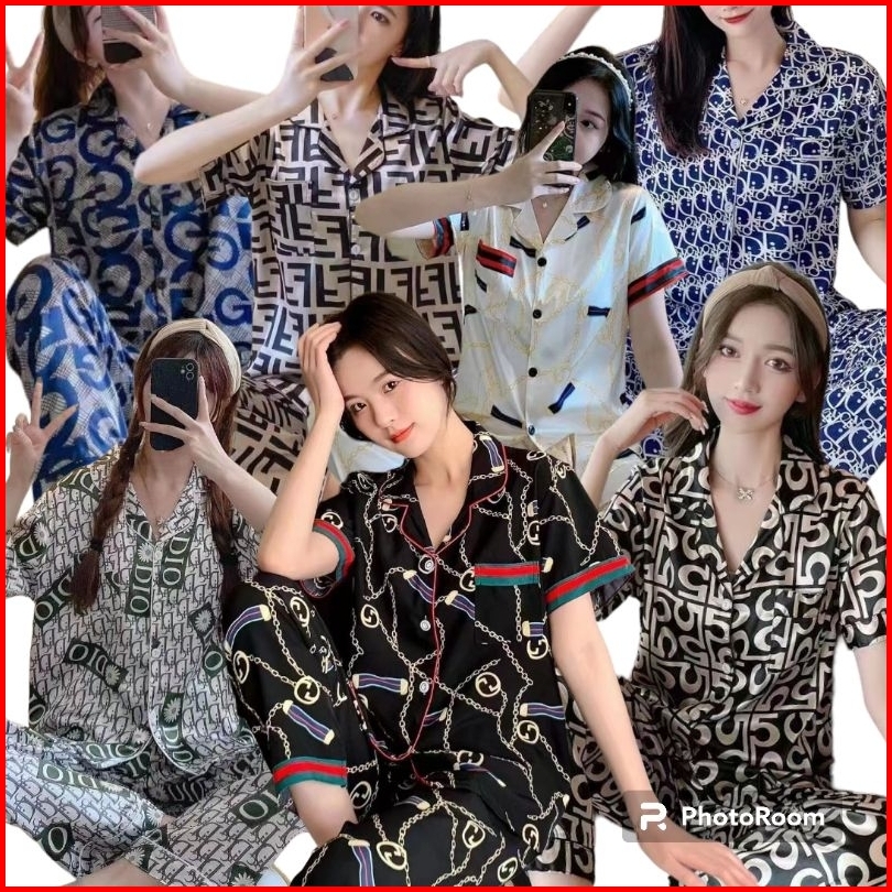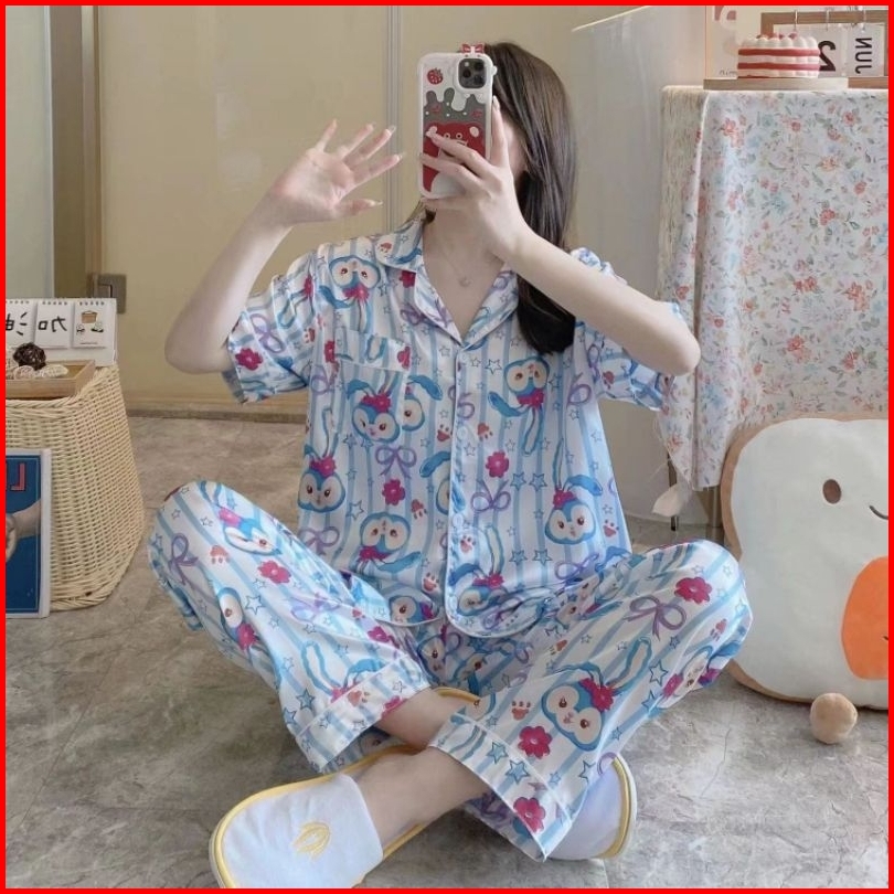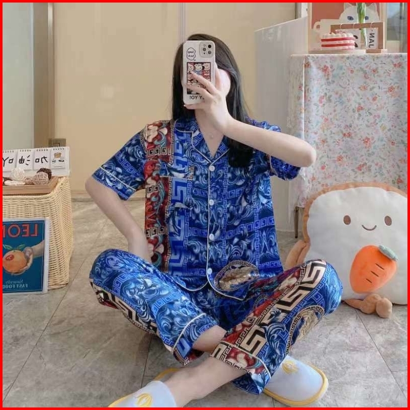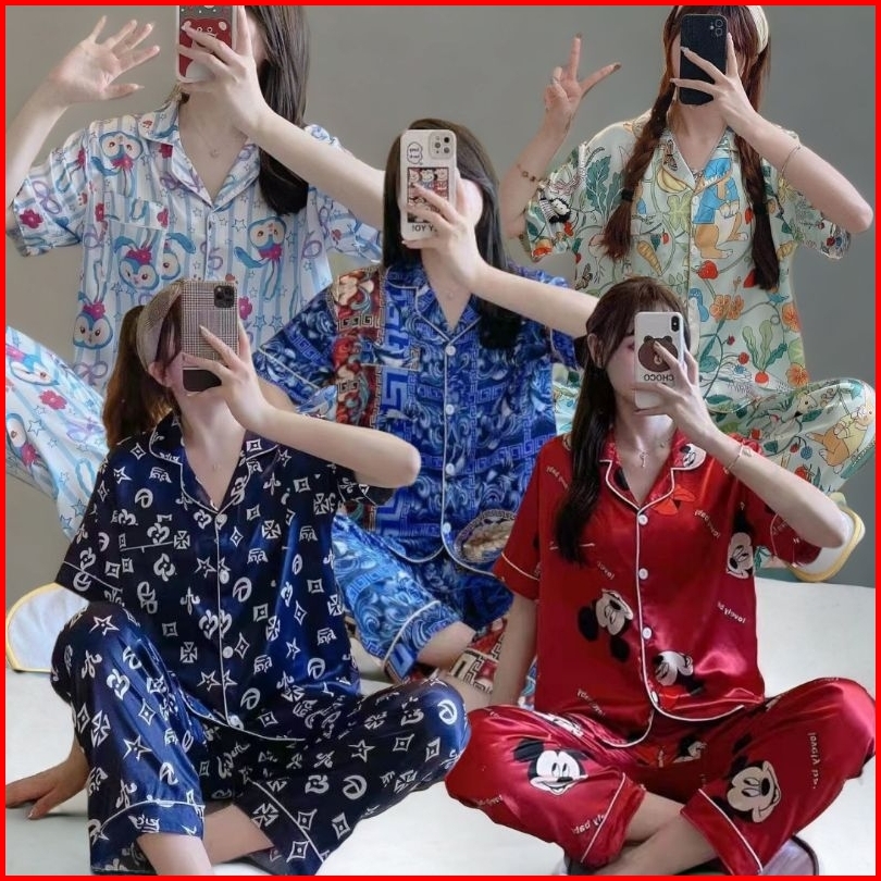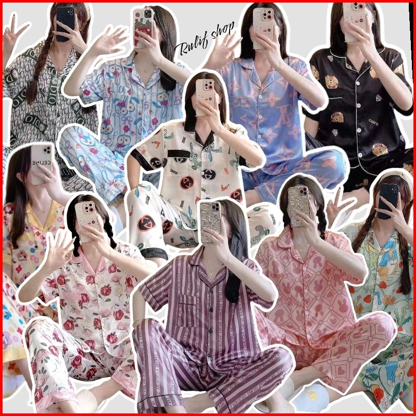 Rulif Piyama Baju Tidur Wanita Satin Import Pemium Set Piyama Saten Lengan Pendek Celana Panjang Set Kemeja Satin Import