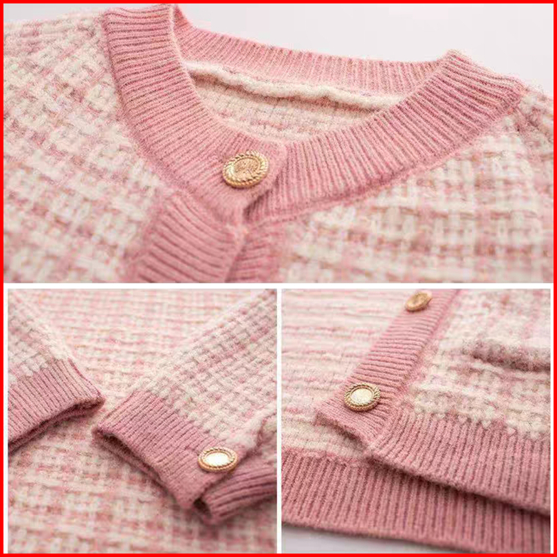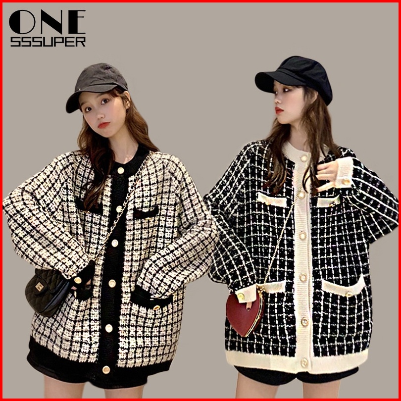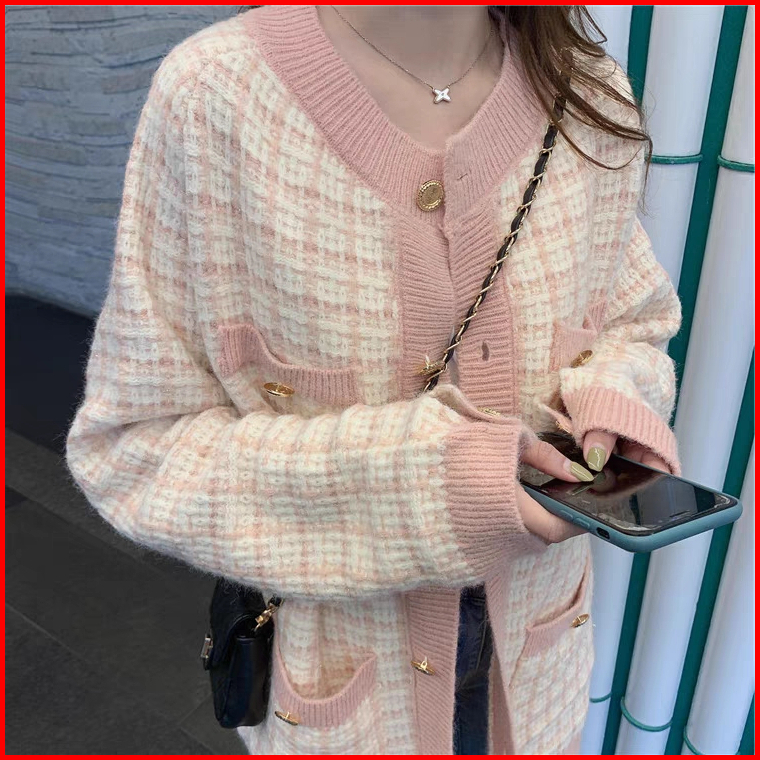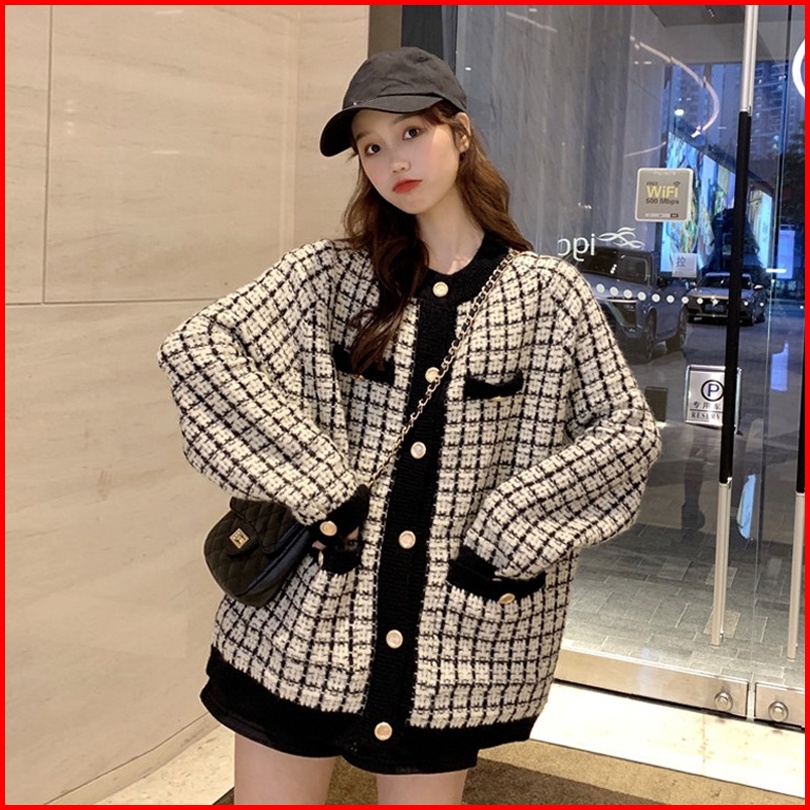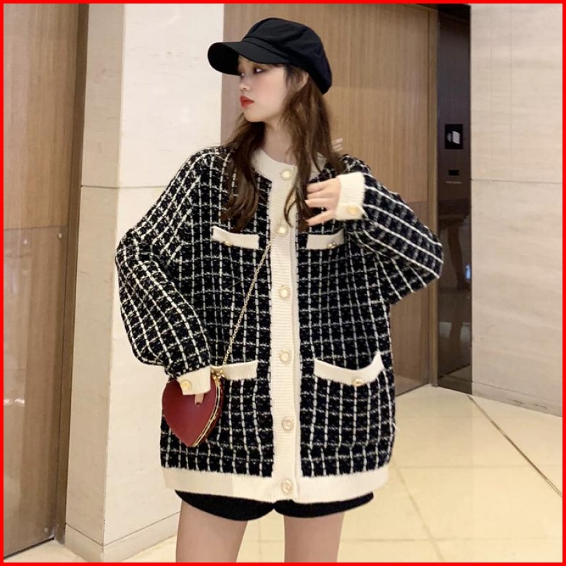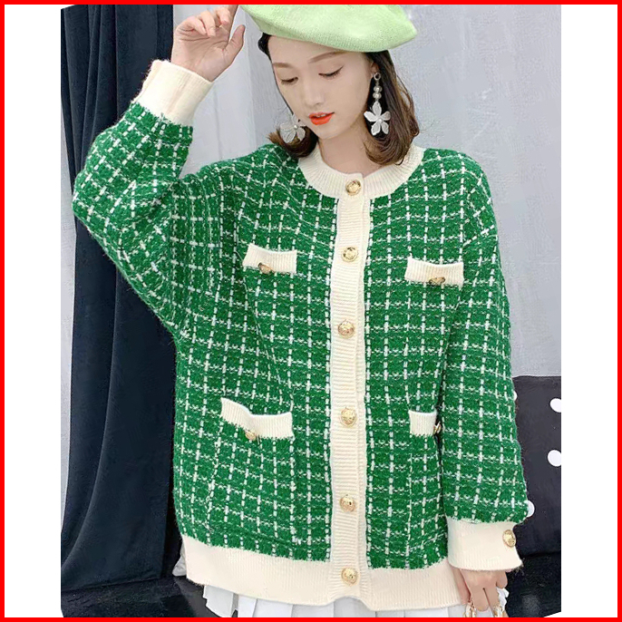 Putih Hitam Merah Muda Hijau Sweater Rajut Kotak-kotak Lengan Panjang Gaya Korea Jaket Sweater Retro Longgar Panjang Sed