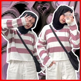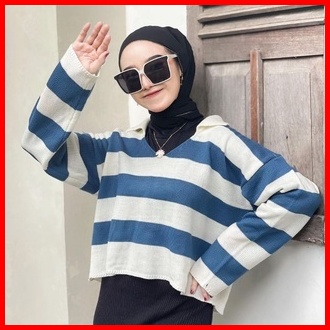 Sweater Rajut Fuji Crop Top Wanita Korea Stripe Blaster Knit Belang