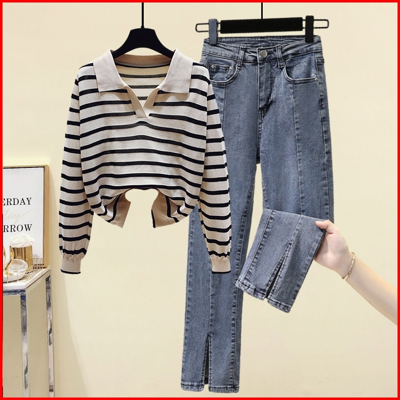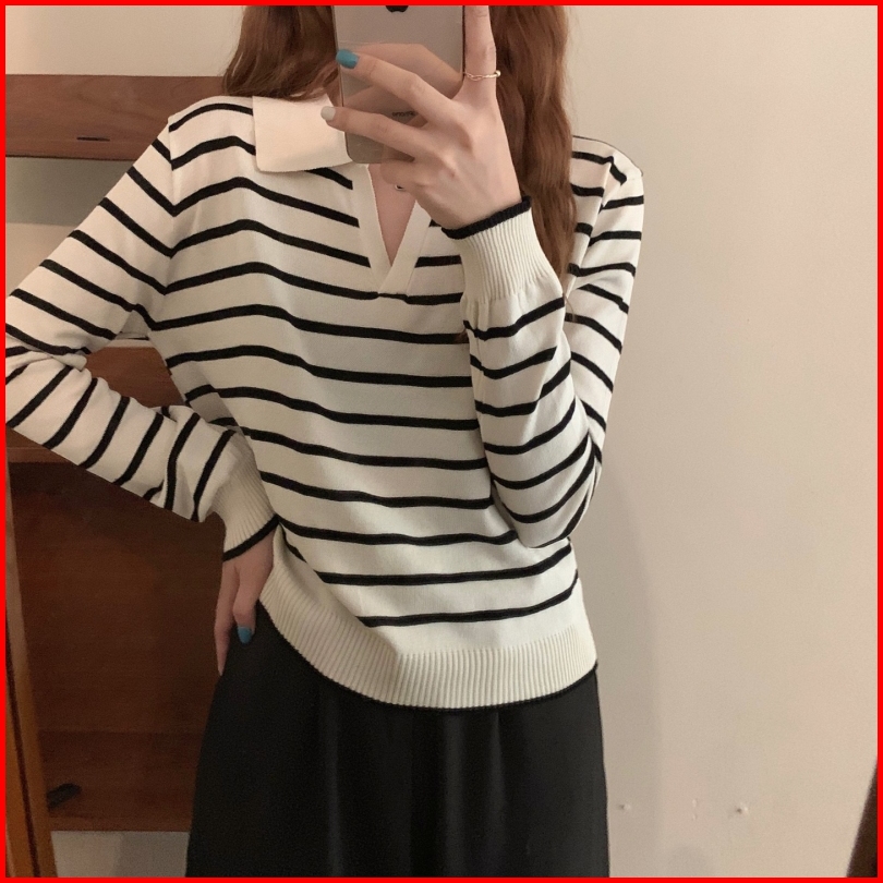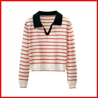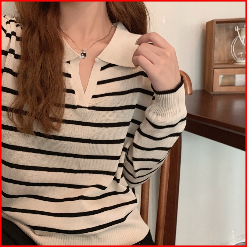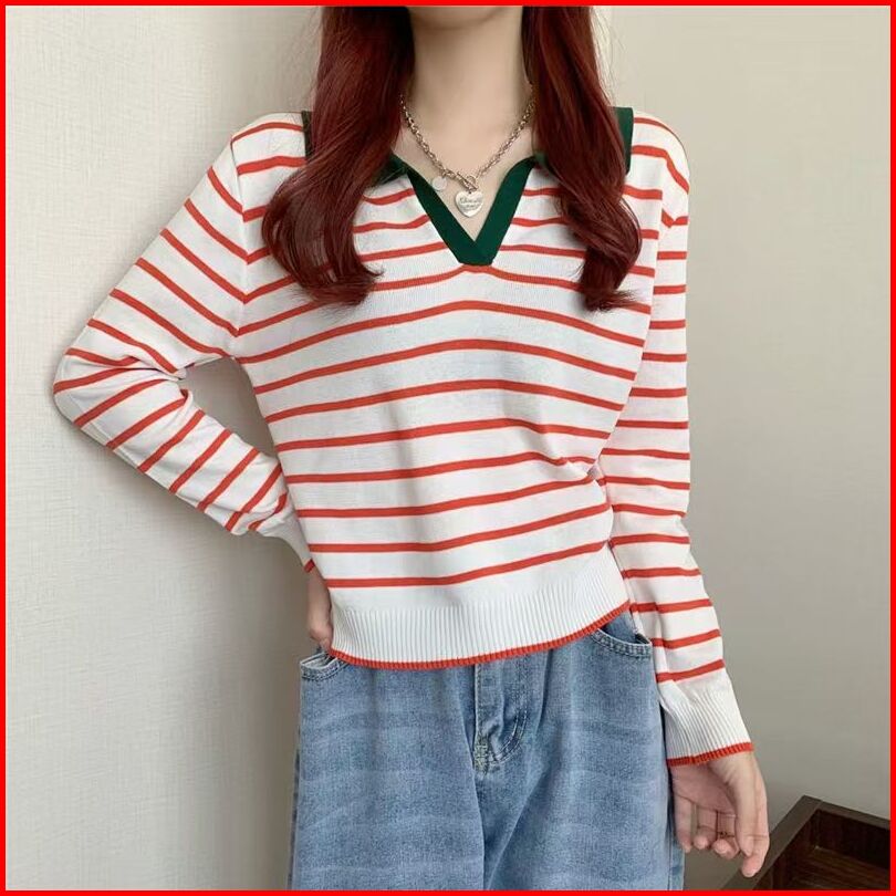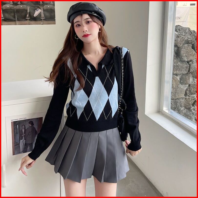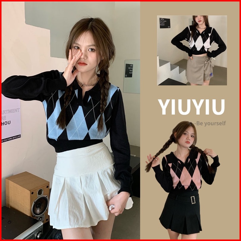 Yiu Yiu Rajut - Polo Shirt Sweater Rajut Crop Top Tartan Wanita Lengan Panjang Korean Style