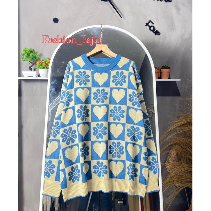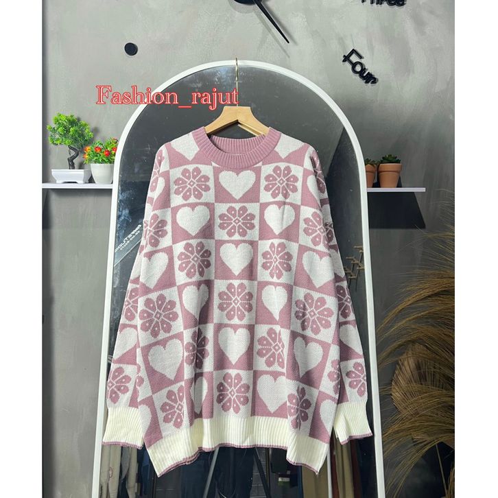 Sweater OverSIze Wanita Motif Love Cantik Atasan Switer Perempuan Lengan Panjang Bahan Rajut Tebal Halus Semua Ukuran