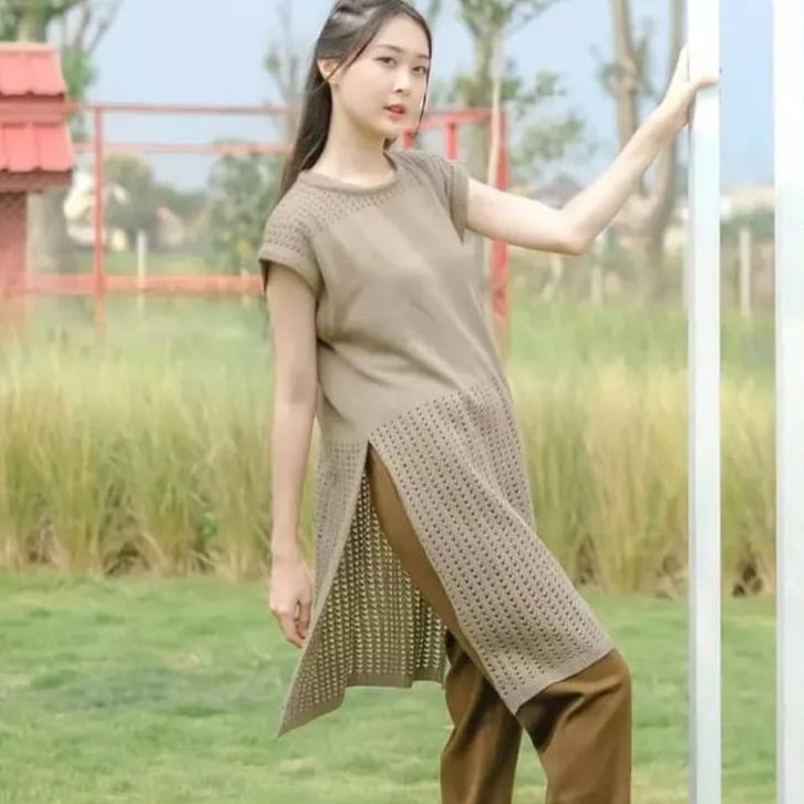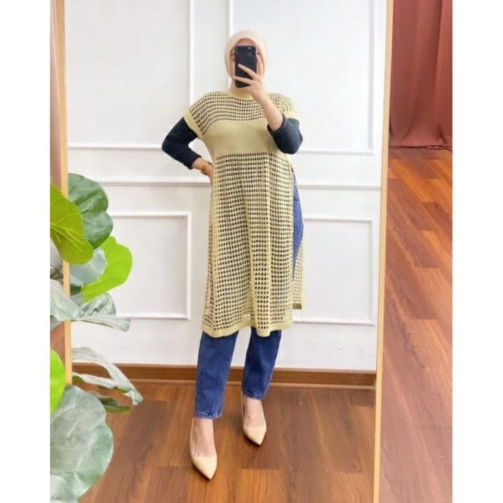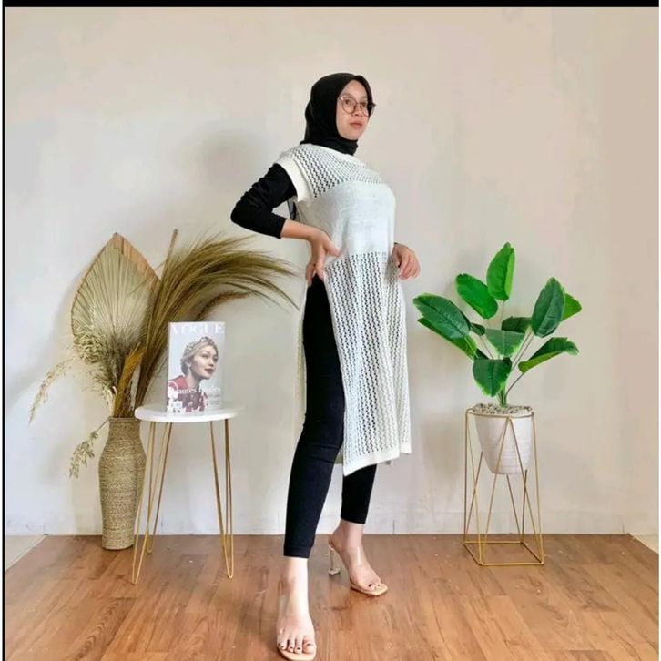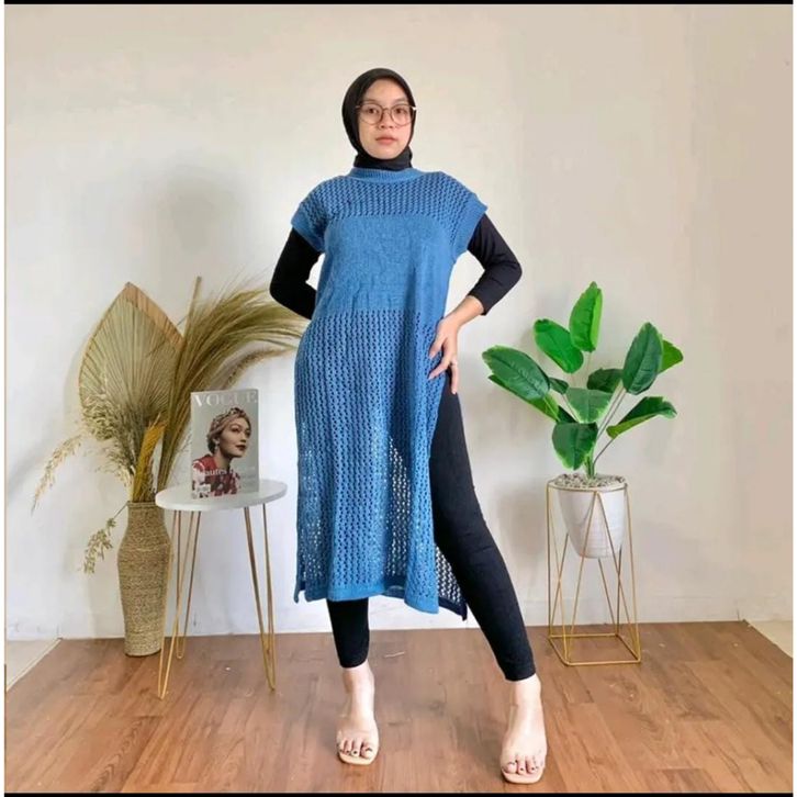 Baju Tunik Wanita Tanpa Lengan Atasan Long Tunic Kekinian Perempuan Rajut Tebal Belah Samping Kasual Santai Nyaman adem