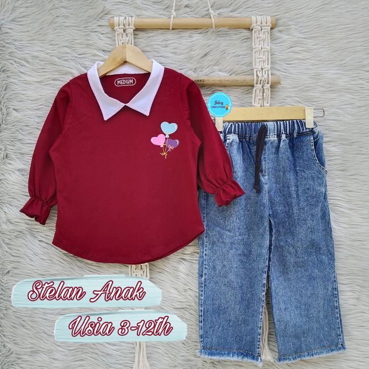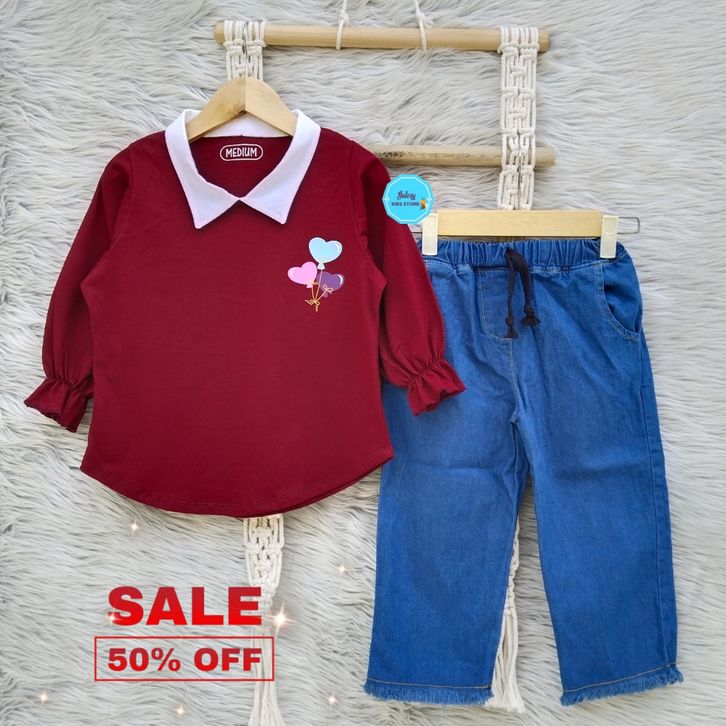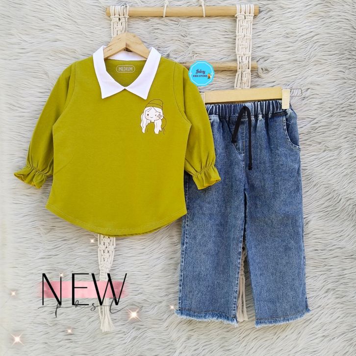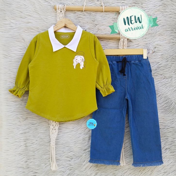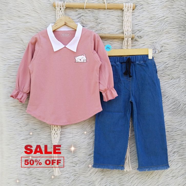 Galery kids setelan kaos anak perempuan lengan panjang umur 3-12 tahun katun combed denim kulot cewek setelan