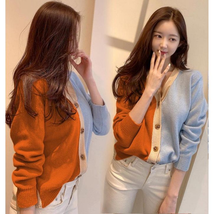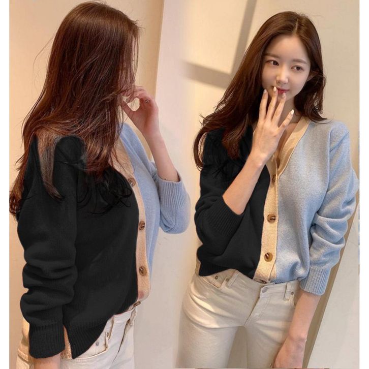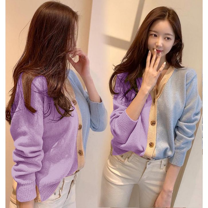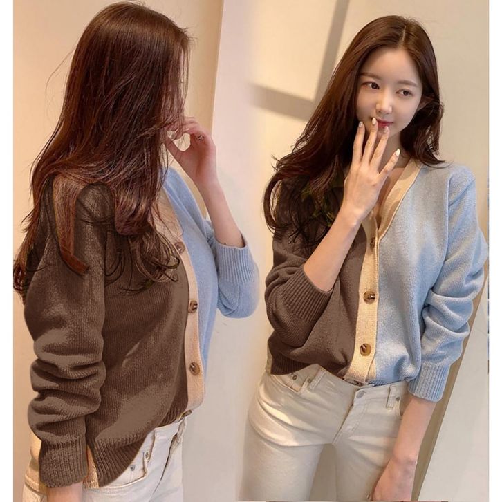 Cardigan Rajut Cewek Atasan Baju Kardigan Outer Luaran Perempuan Warna Kombinasi Lengan Panjang Casual Modis