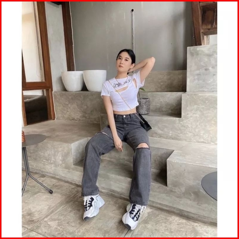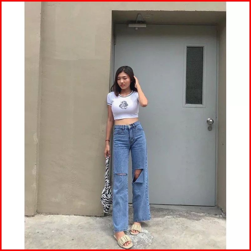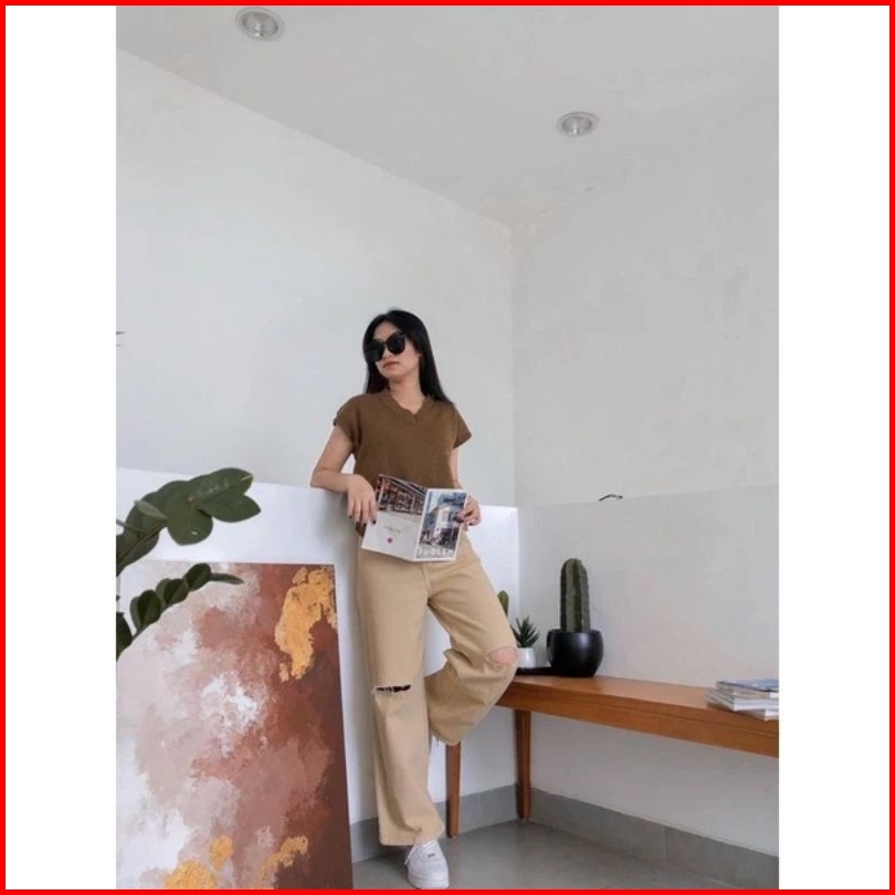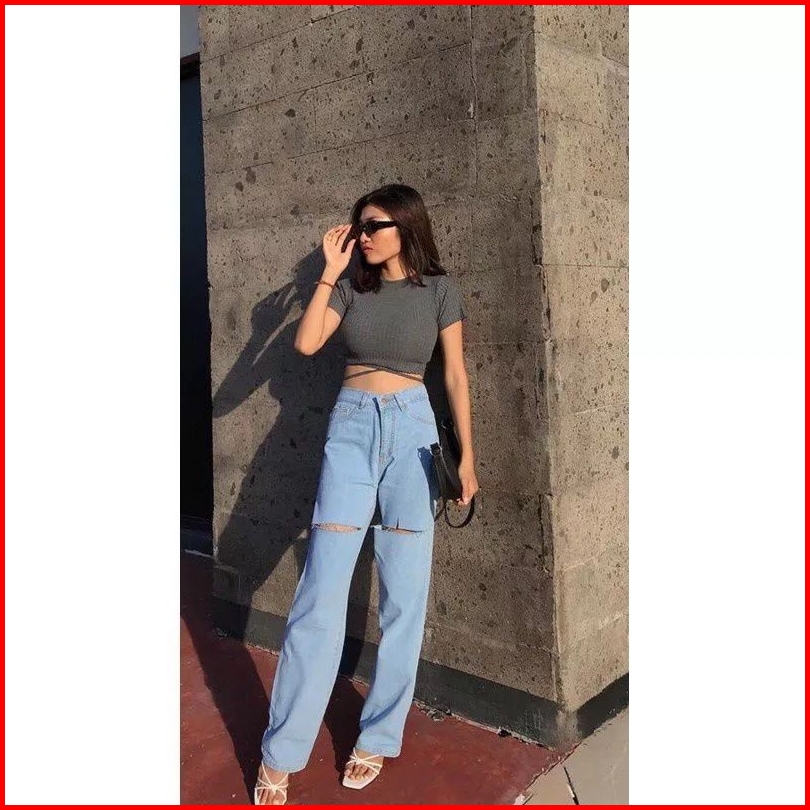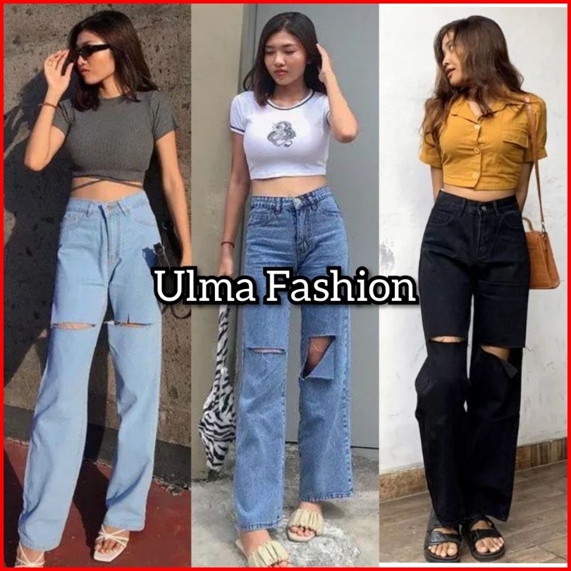 Celana Kulot Jeans Wanita Sobek Ripped Jins Denim Highwaist Termurah Cewek