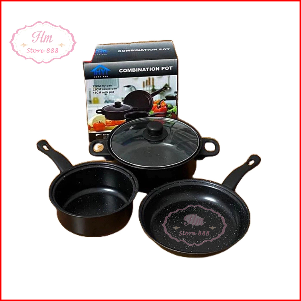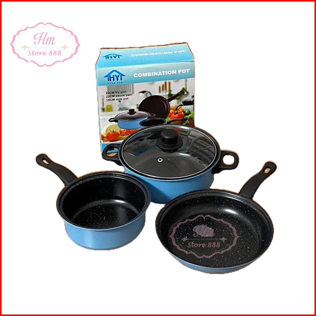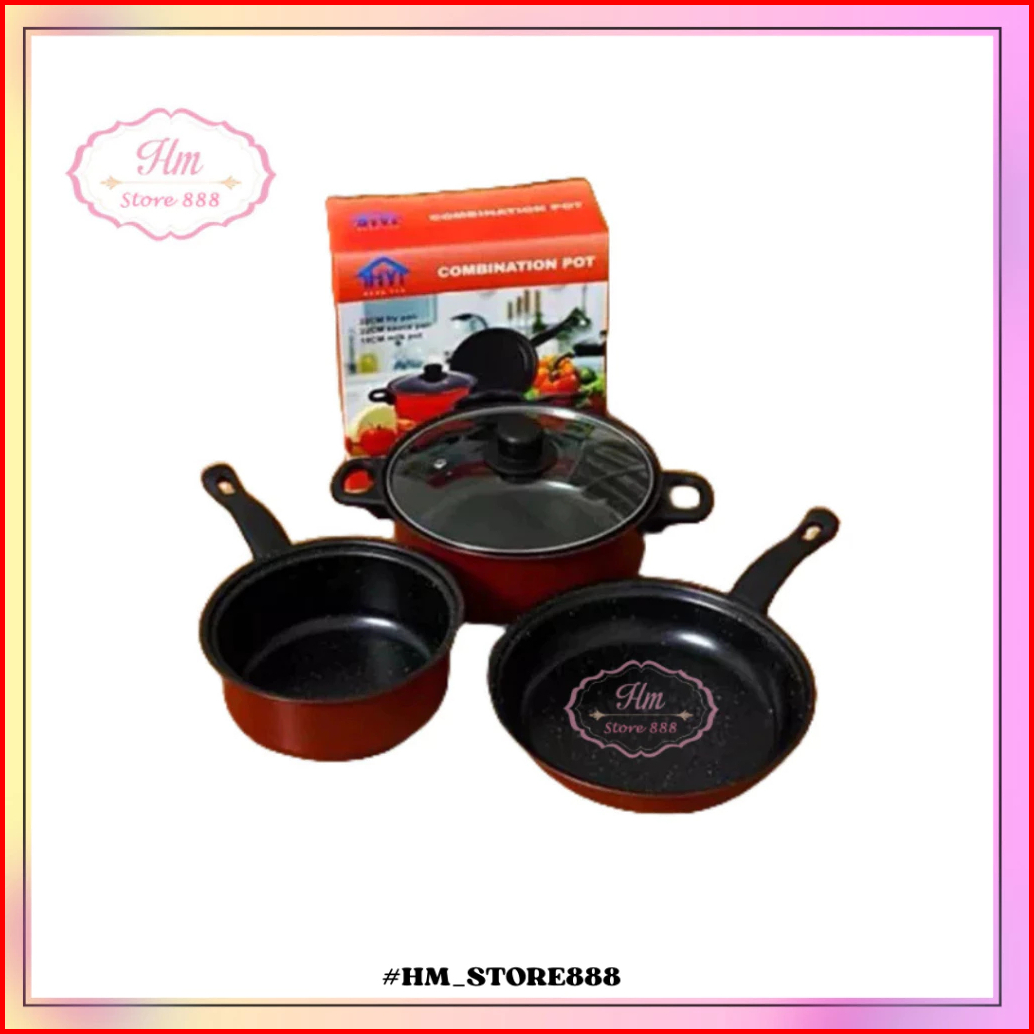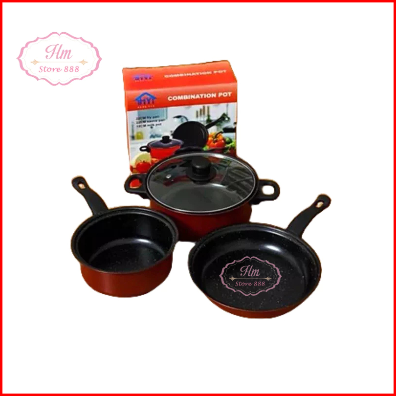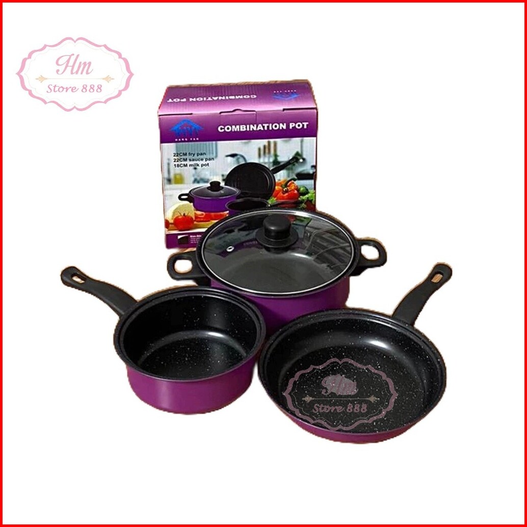 Hm - Panci Set Isi 3pcs Wajan Teflon Stainless Steel Cookware Set Free Penutup Kaca Panci Kukus