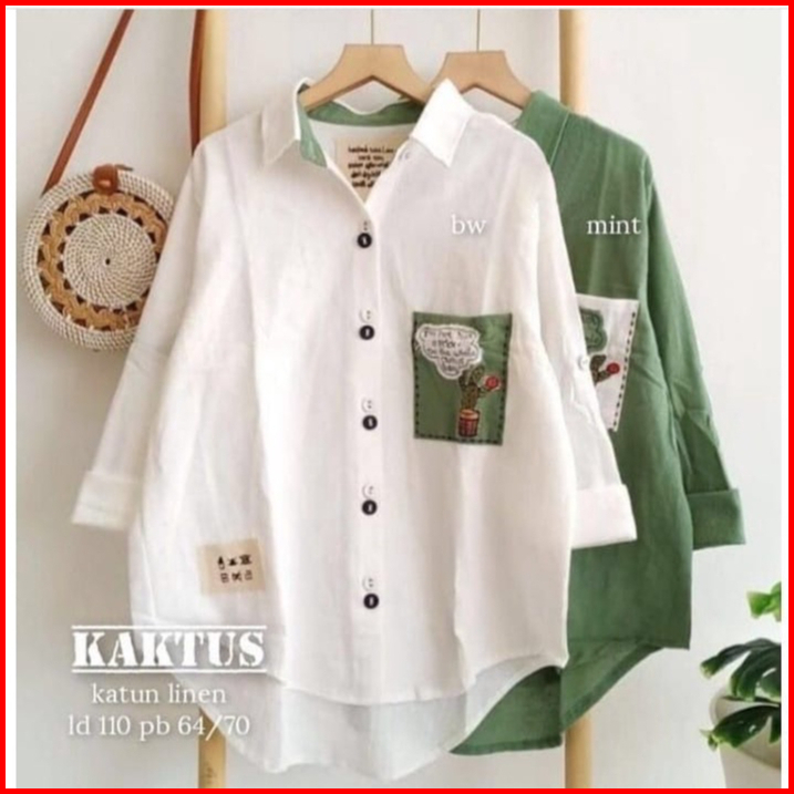 Vallina Outfit - Kaktus Shirt Blouse Path Embroidery Linen Rami Baju Atasan Wanita Muslim Tunik Premium M - Xl