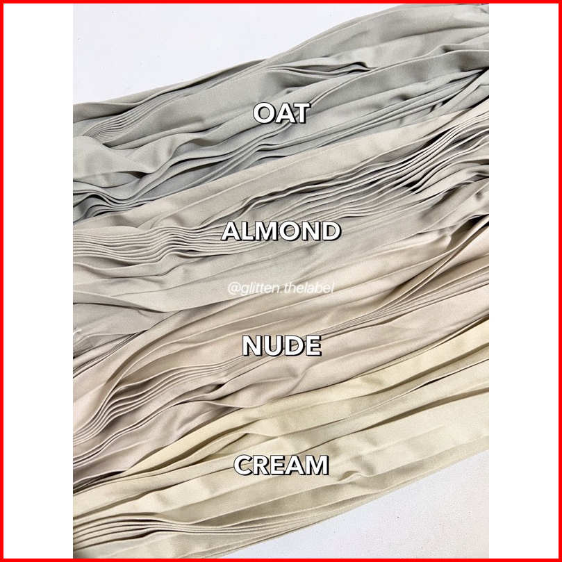 Taupe, Golden, Hitam, Smoke, Abu tua, Denim, Milo, Broken white, Coksu, Khaki, Thaitea, Baby pink, Maroon, Baby blue, Royal blue, Olive, Emerald green, Fanta, Magenta, Army, Sage, Biru turq, Hijau botol, Almond, Oat, Cream, Bata, Navy, Mint, Silver, Latte, Mocca, Hijau turq, Lemon, Abu Muda, Violet, Dusty ungu, Cinnamon, Pramuka, Sunkist, Ungu pastel, Hijau Tua, Ash grey, Stone, Biscuit, Hitam (panjang 82cm), Almond (pnjang 82cm), Cream (panjang 82cm), Coksu (panjang 82cm), Taupe (panjang 82cm), Nude, Salmon, Chestnut, Metalic grey, B.white (pnjg 82cm), Merah