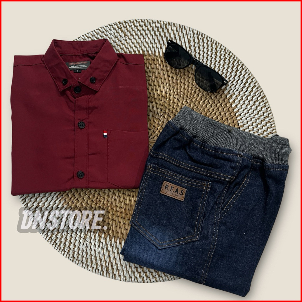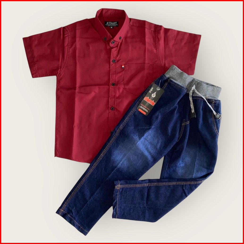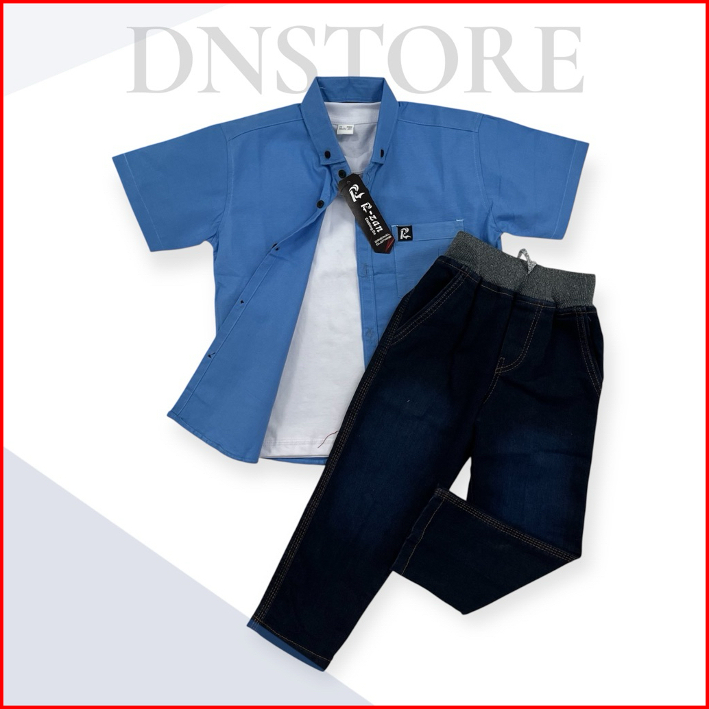 Setelan Kemeja Anak Laki-laki Lengan Pendek Motif Polos Celana Jeans 3-10 Tahun