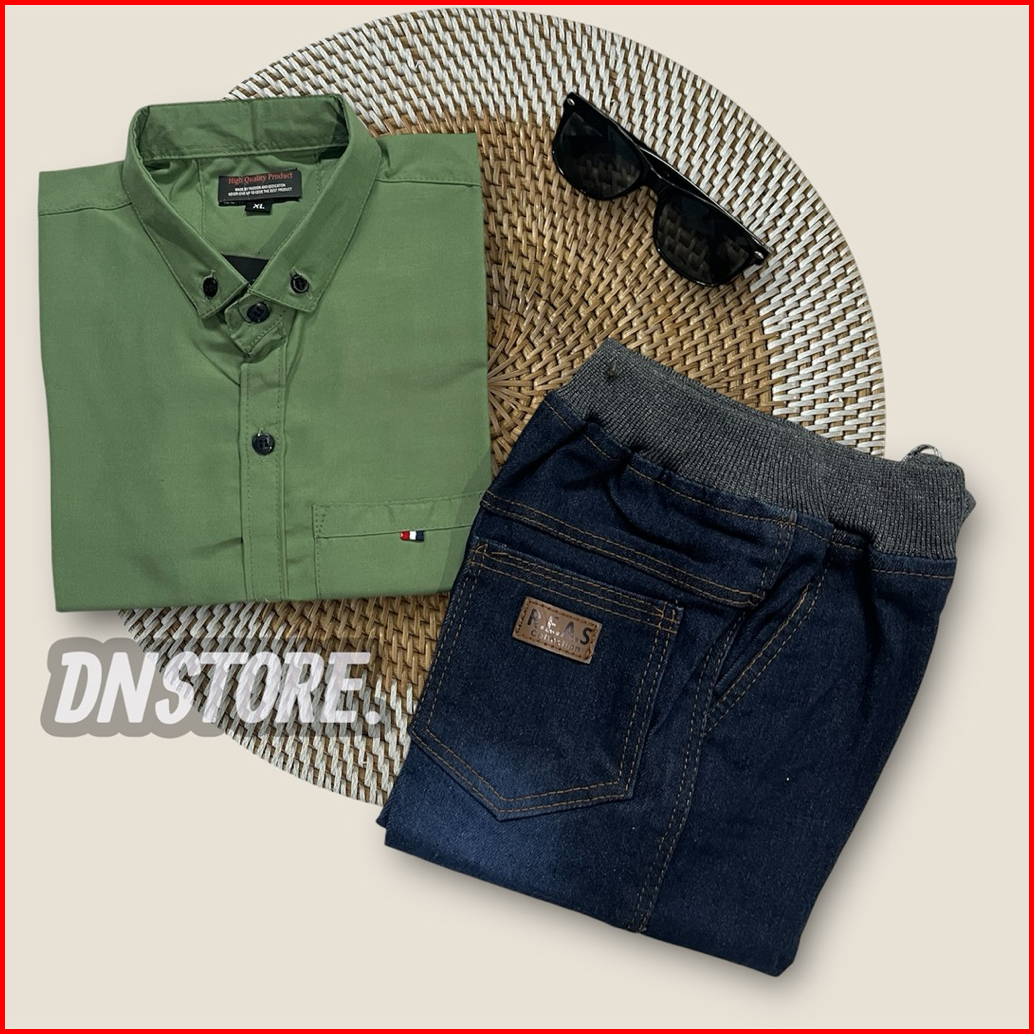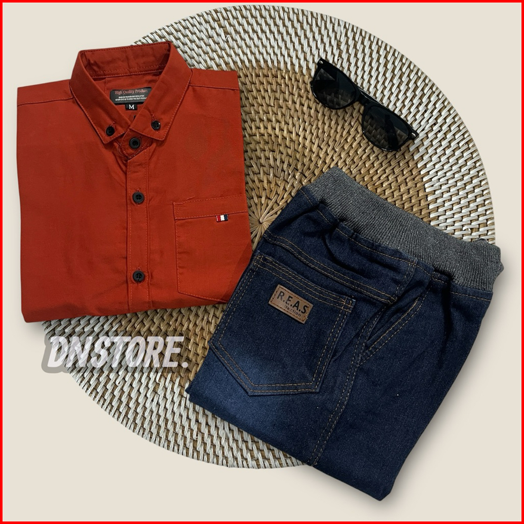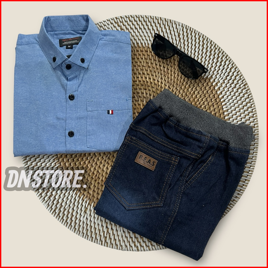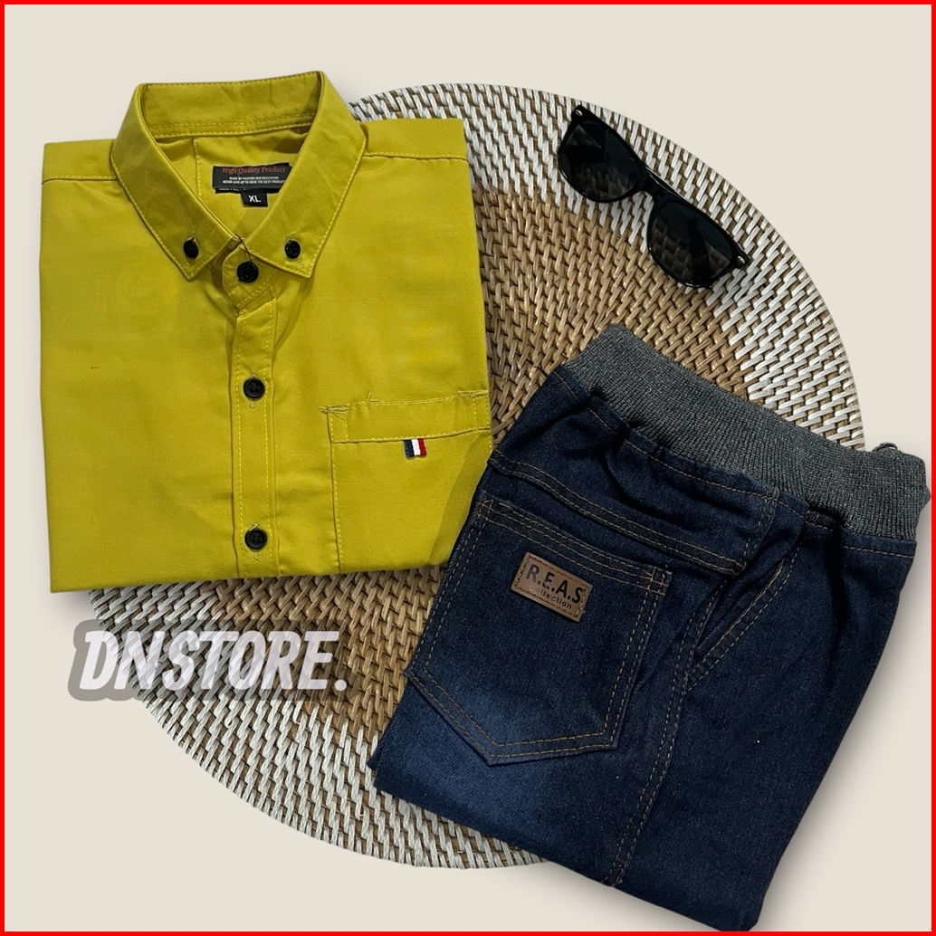 Setelan Kemeja Anak Laki-laki Lengan Pendek Motif Polos Celana Jeans 3-10 Tahun