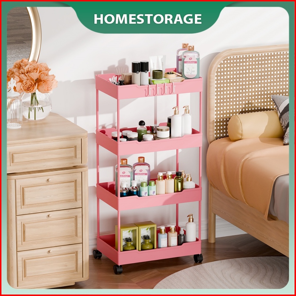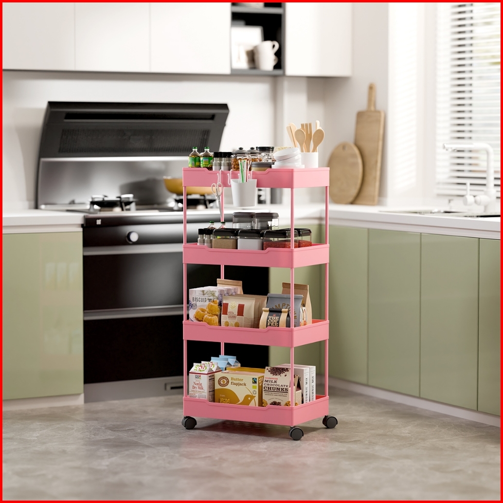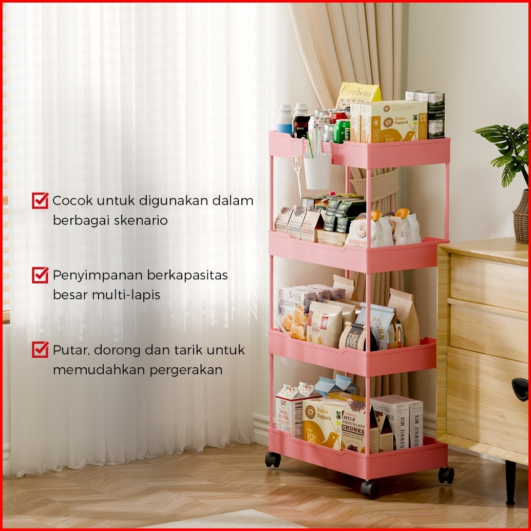 Homestorage Rak Susun Troli Square Rak Penyimpanan Makanan Plastik Rak Troley Rak Serbaguna 4 Tingkat Dengan Roda