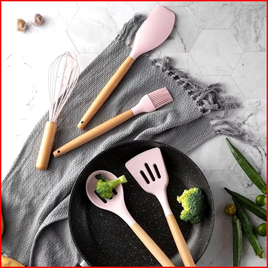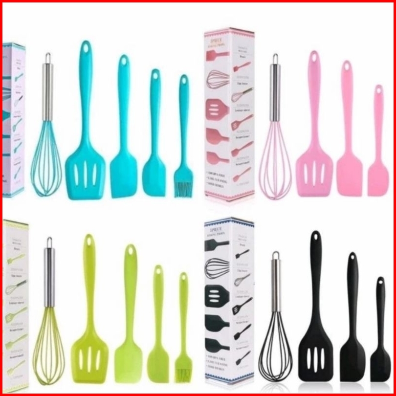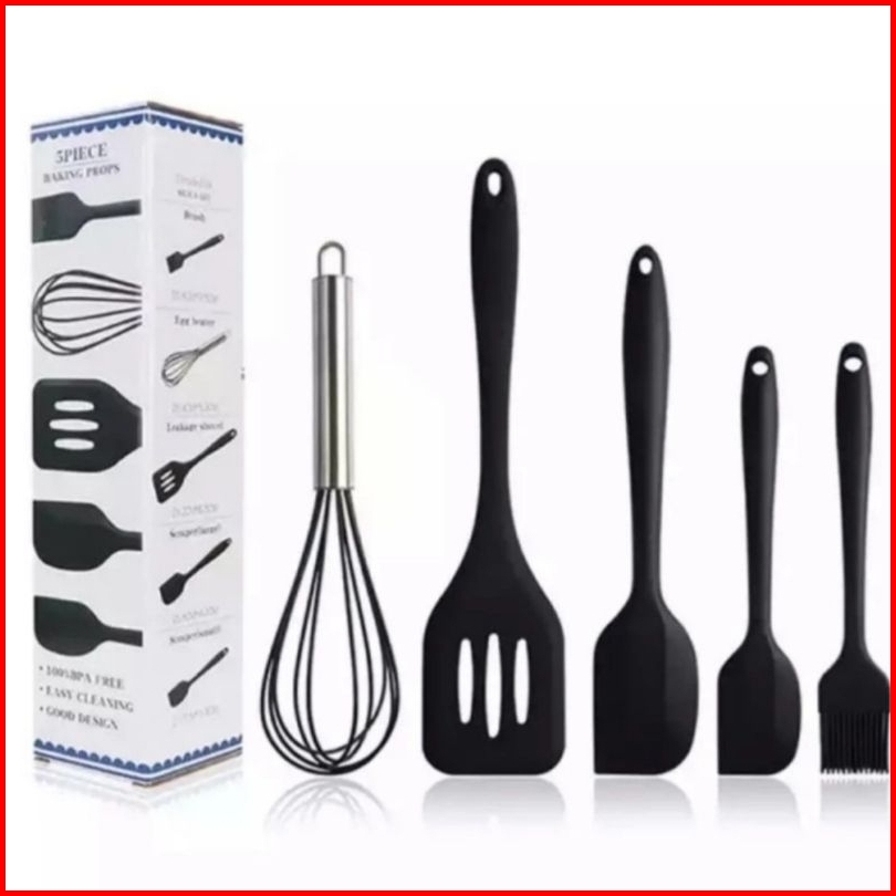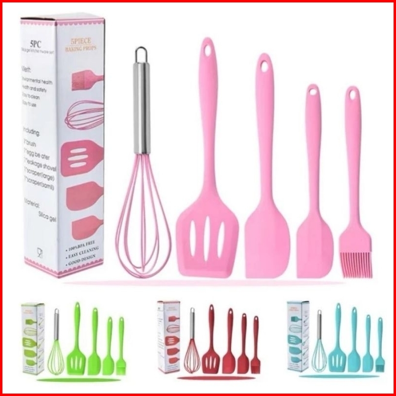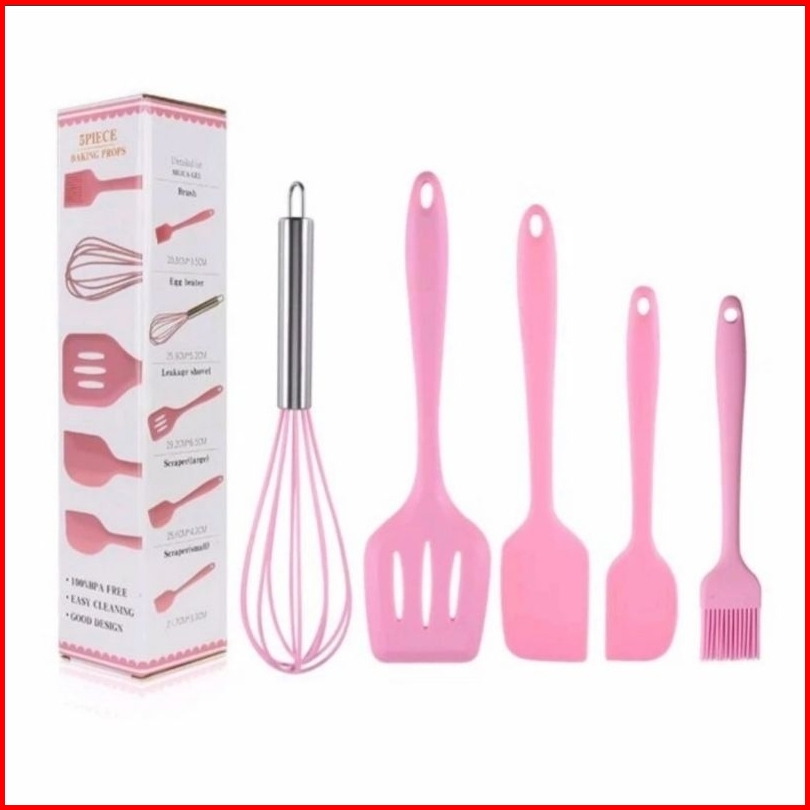 Spatula Set 5 In 1 Silikon Anti Panas Kocokan Kuas Kue Mentega Sutil Perabot Dapur Untuk Masak Warna Pink Hitam