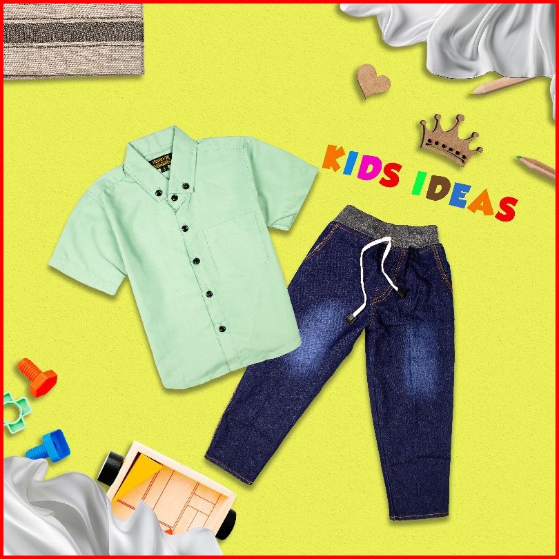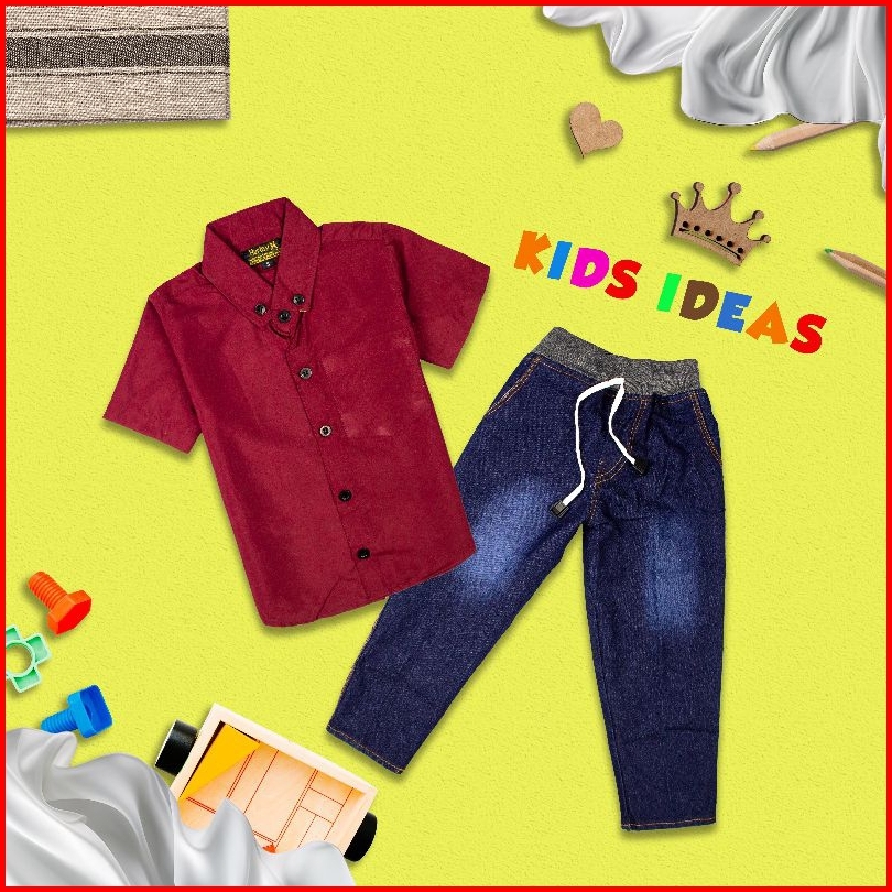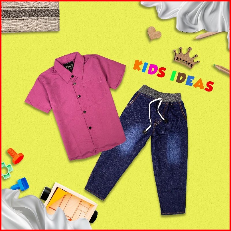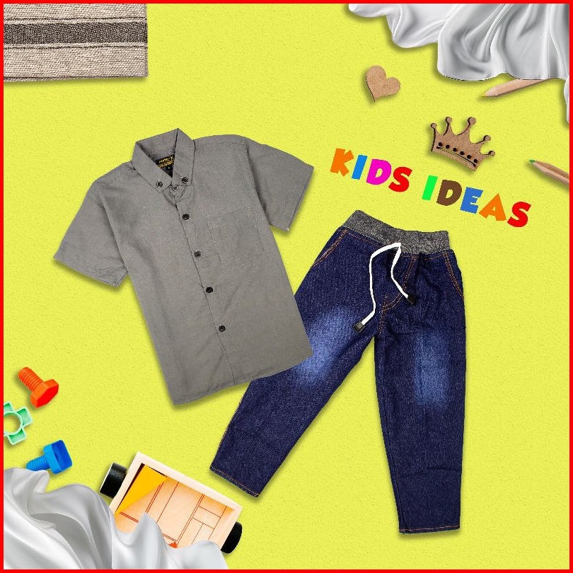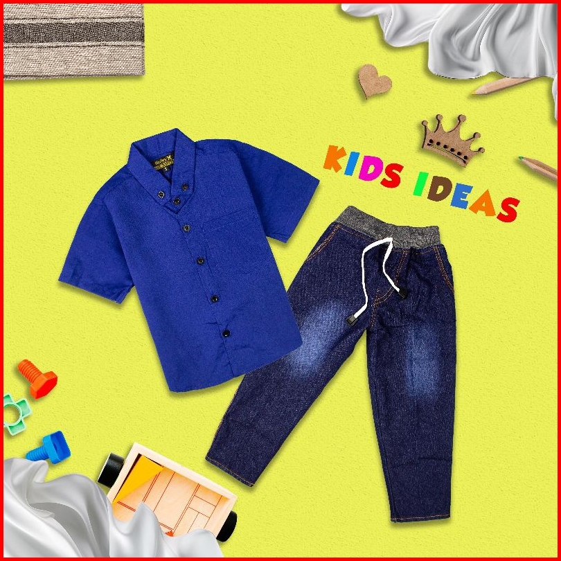 Setelan Anak Laki Baju Kemeja Lengan Pendek Dan Celana Panjang Jeans Konveksi Aji