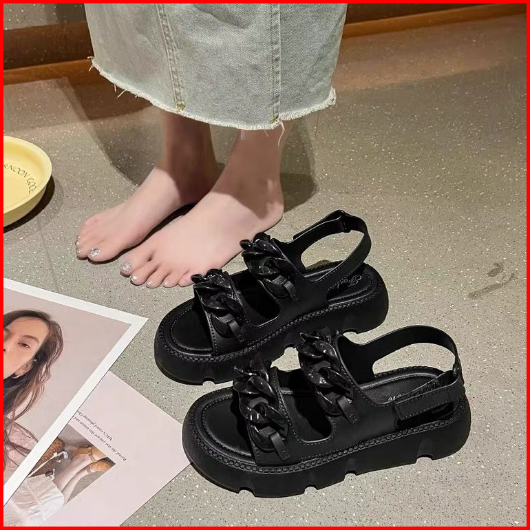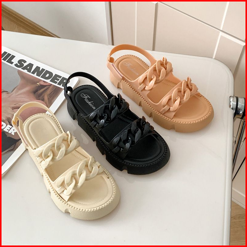 Sandal Selop Wanita Model Korea Ready Stock Tipe Tali Rantai Wedges Anti Air Dan Anti Selip