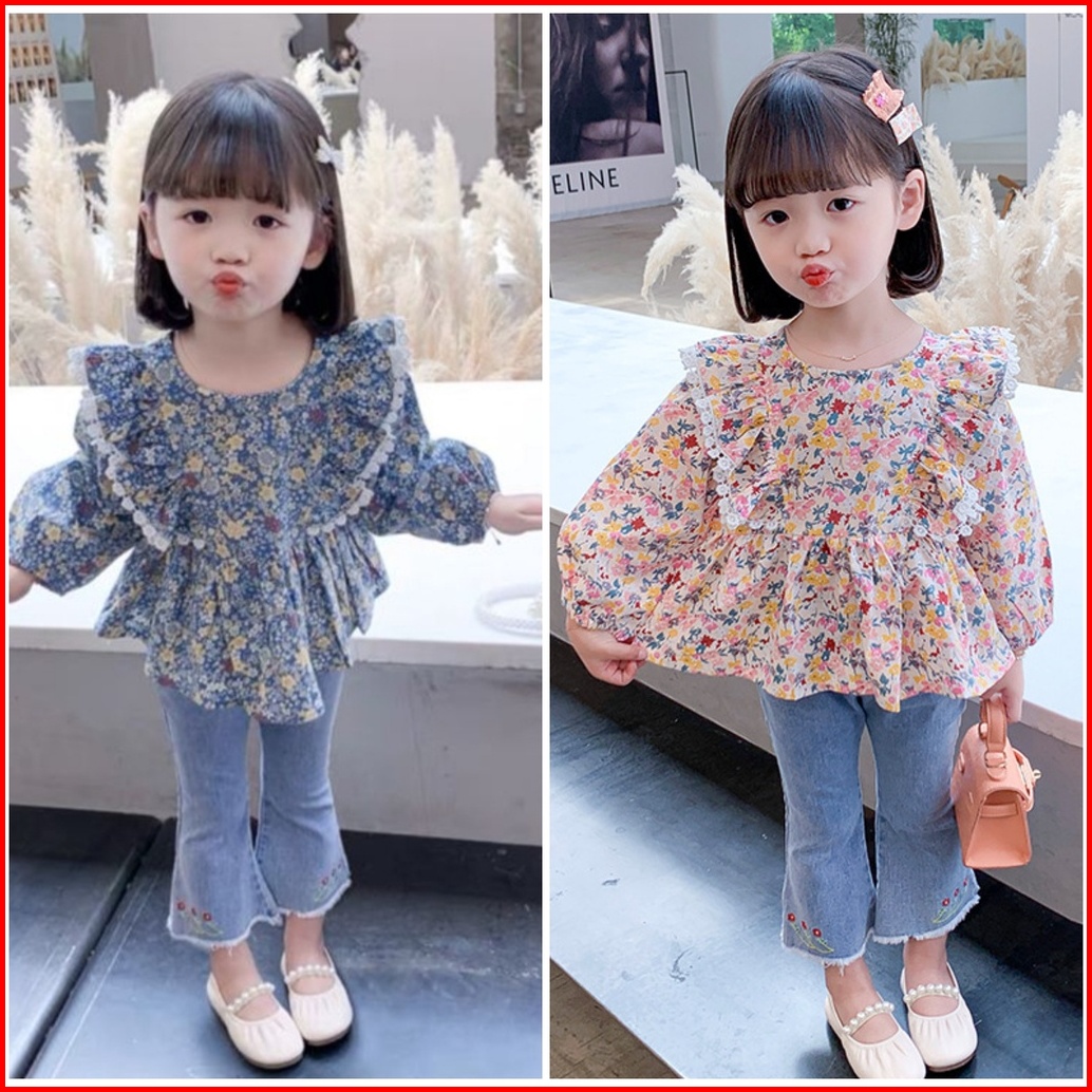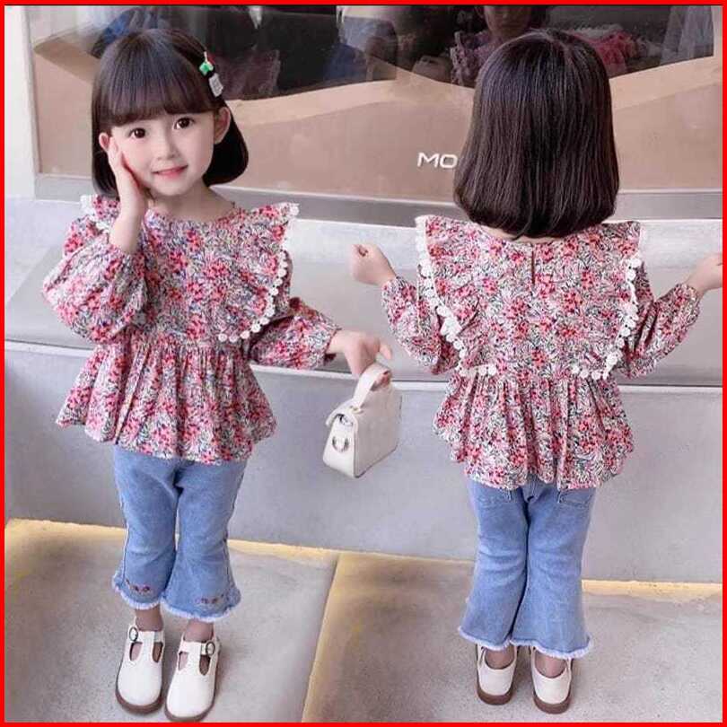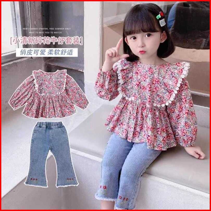 Meandboss Ssp50 3-9thn Setelan Set Anak Perempuan 2in1 Floral Blouse Jeans