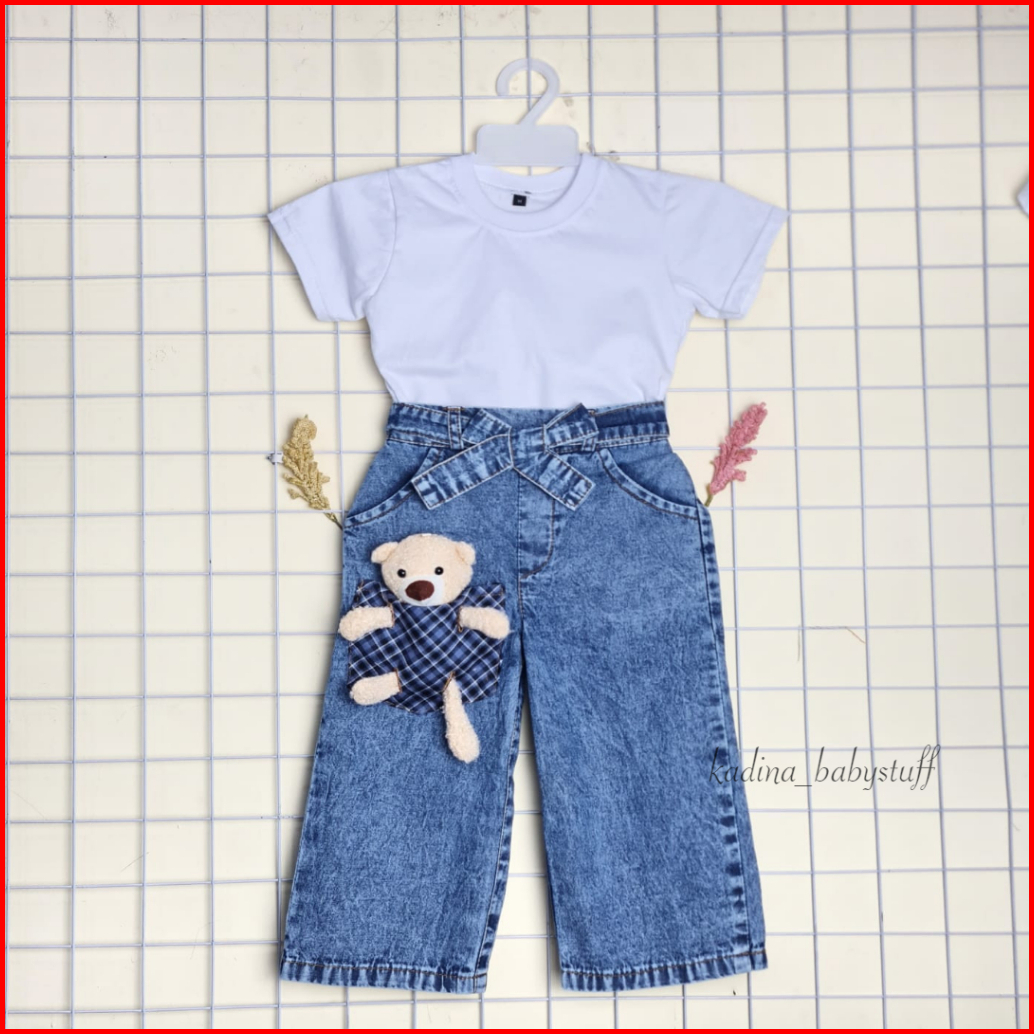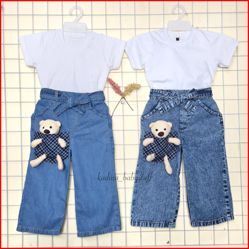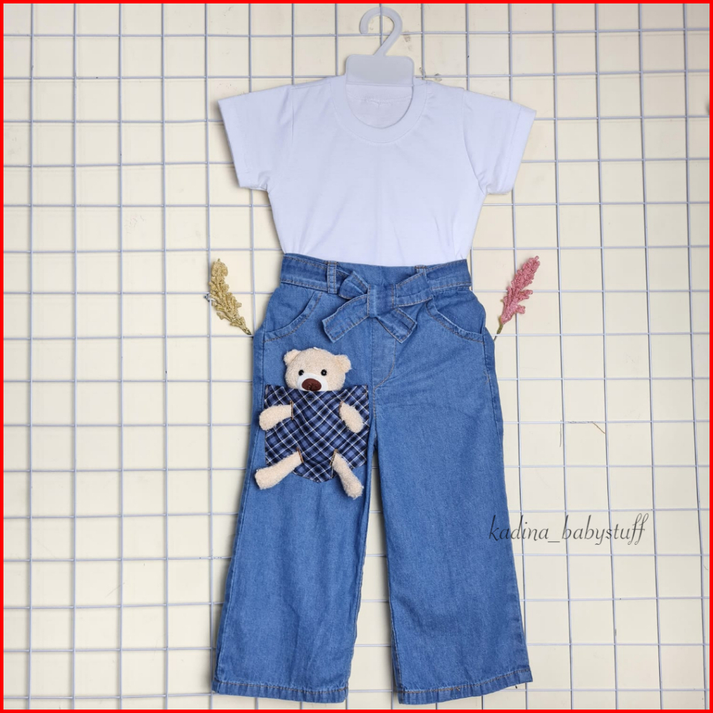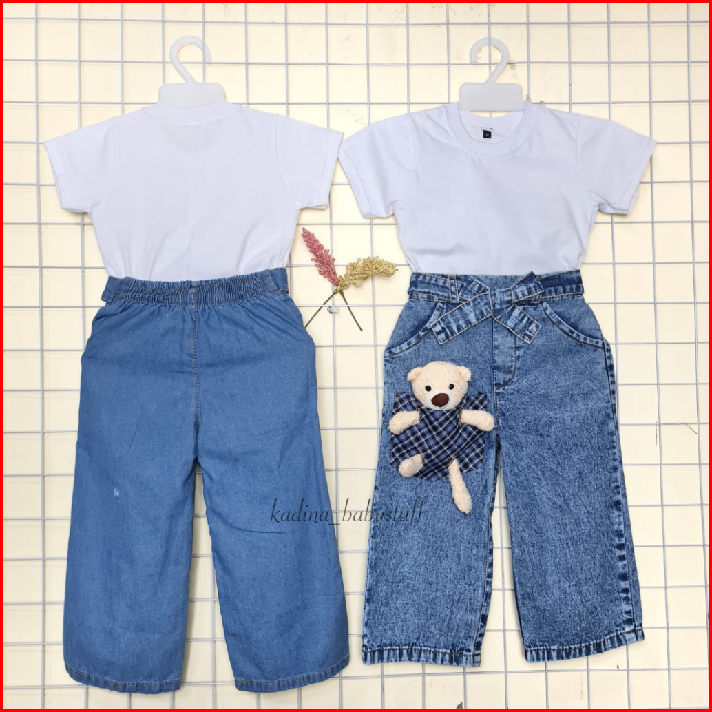 Setelan Jeans Anak Perempuan Kulot Jeans Motif Boneka Kaos Anak Usia 2-10 Tahun