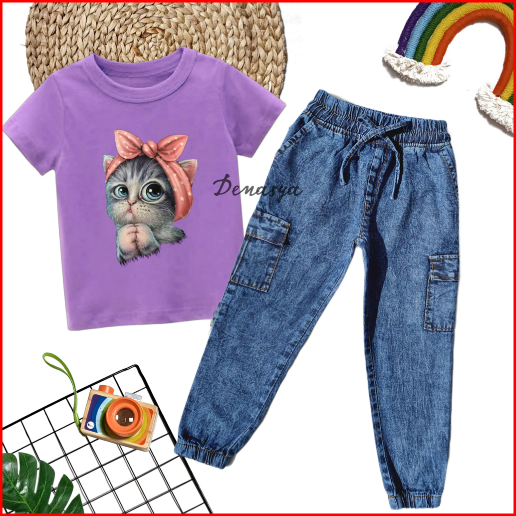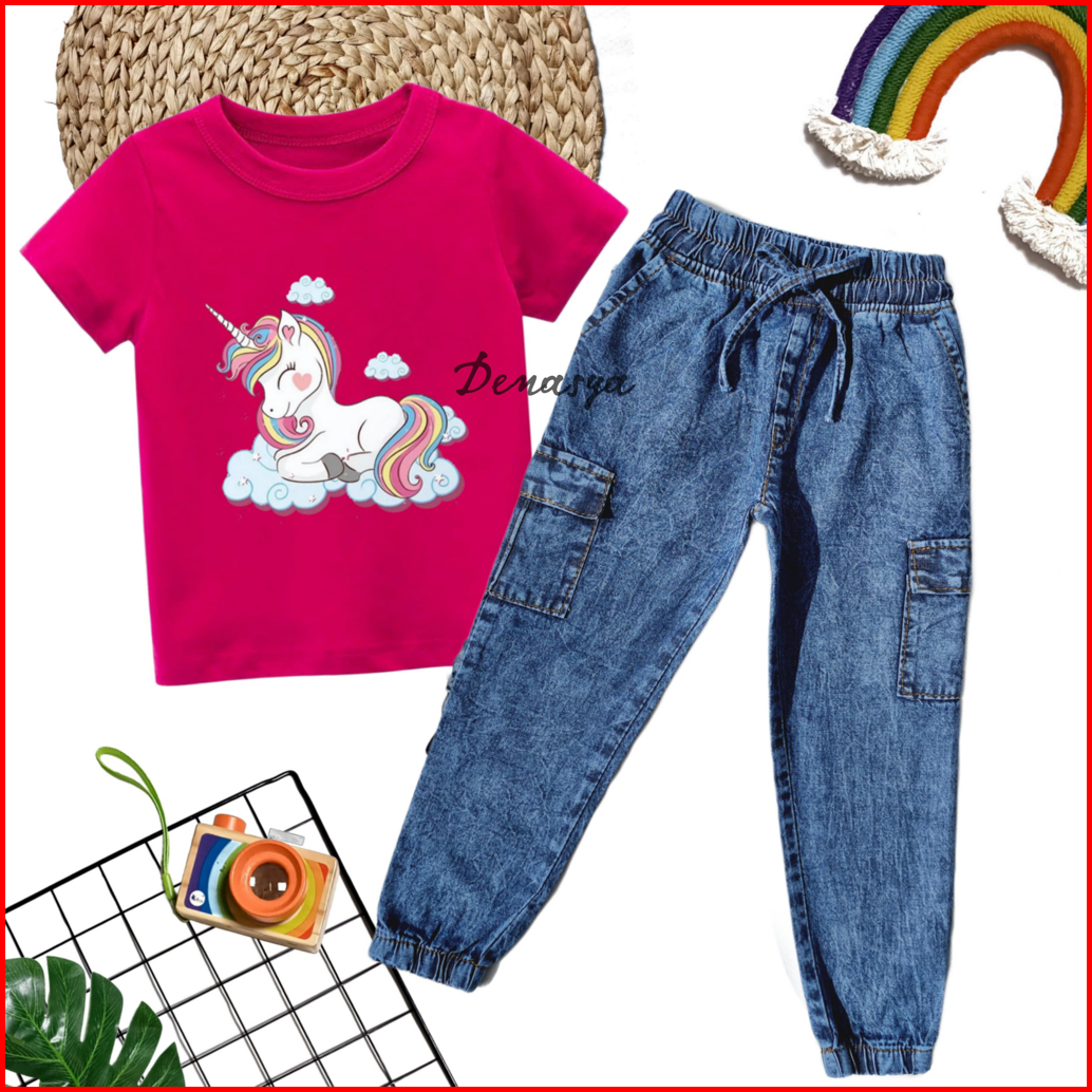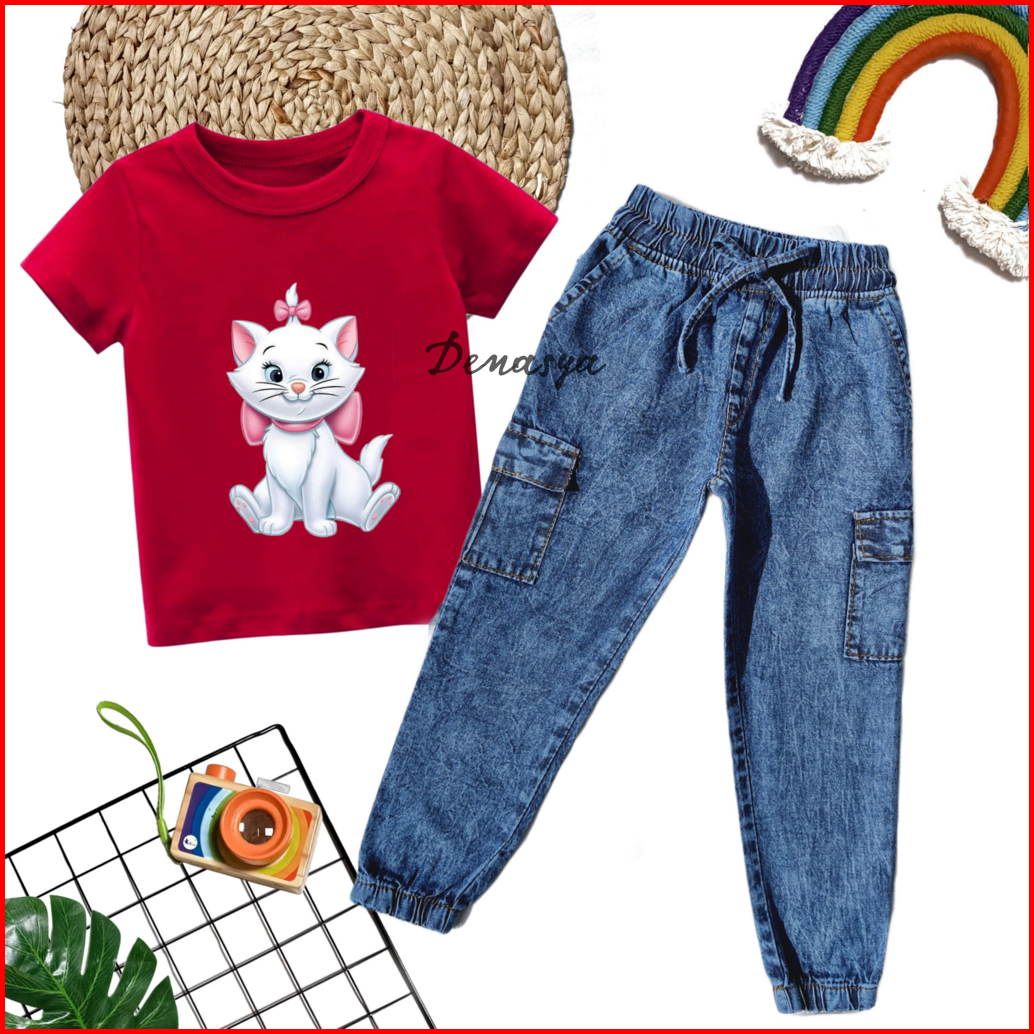 Setelan Anak Perempuan Kekinian Cargo Jeans Anak Snowblue Celana Joger Jeans Anak Joger Cargo Anak Kaos Sablon 1-10 Tahu