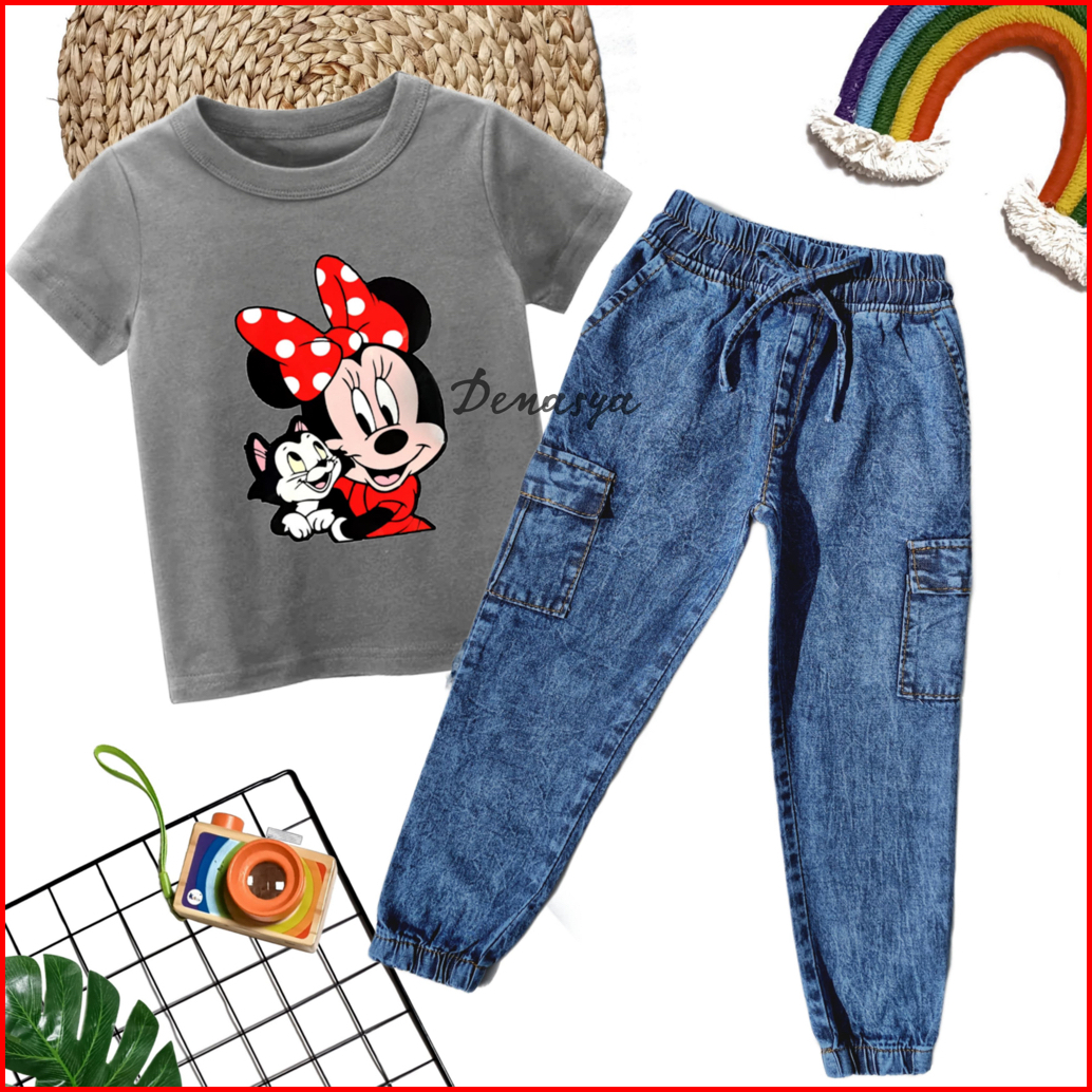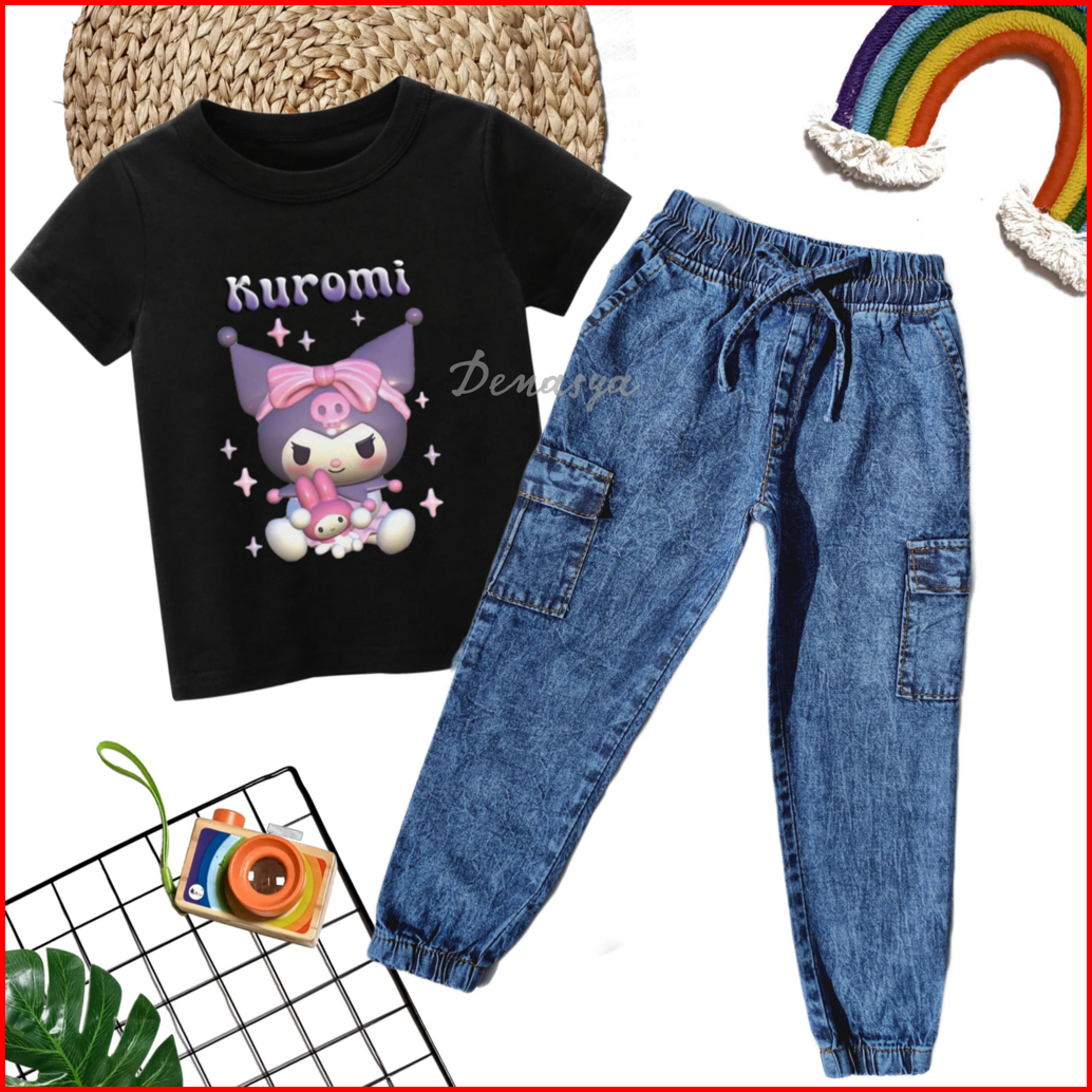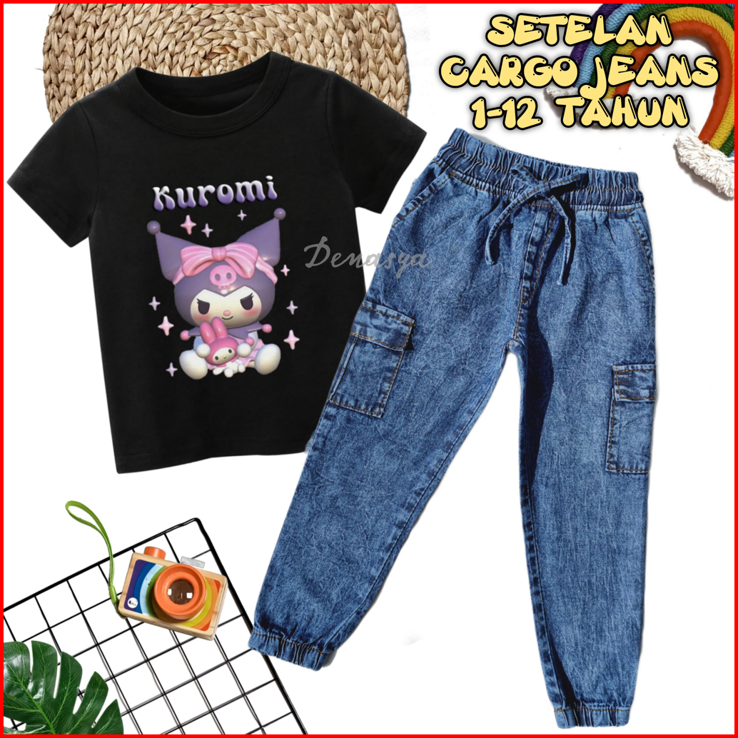 Setelan Anak Perempuan Kekinian Cargo Jeans Anak Snowblue Celana Joger Jeans Anak Joger Cargo Anak Kaos Sablon 1-10 Tahu