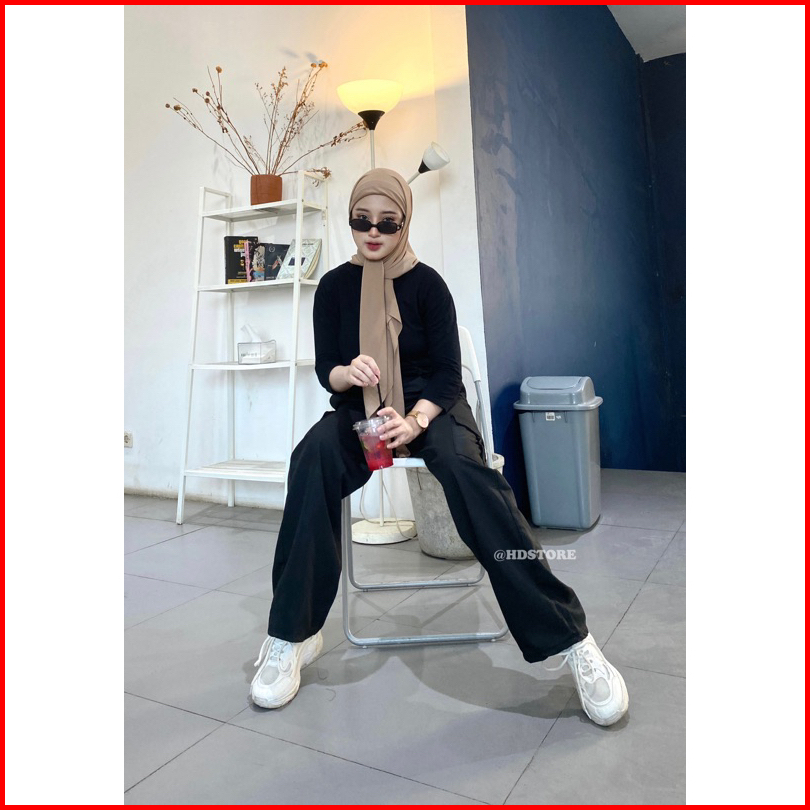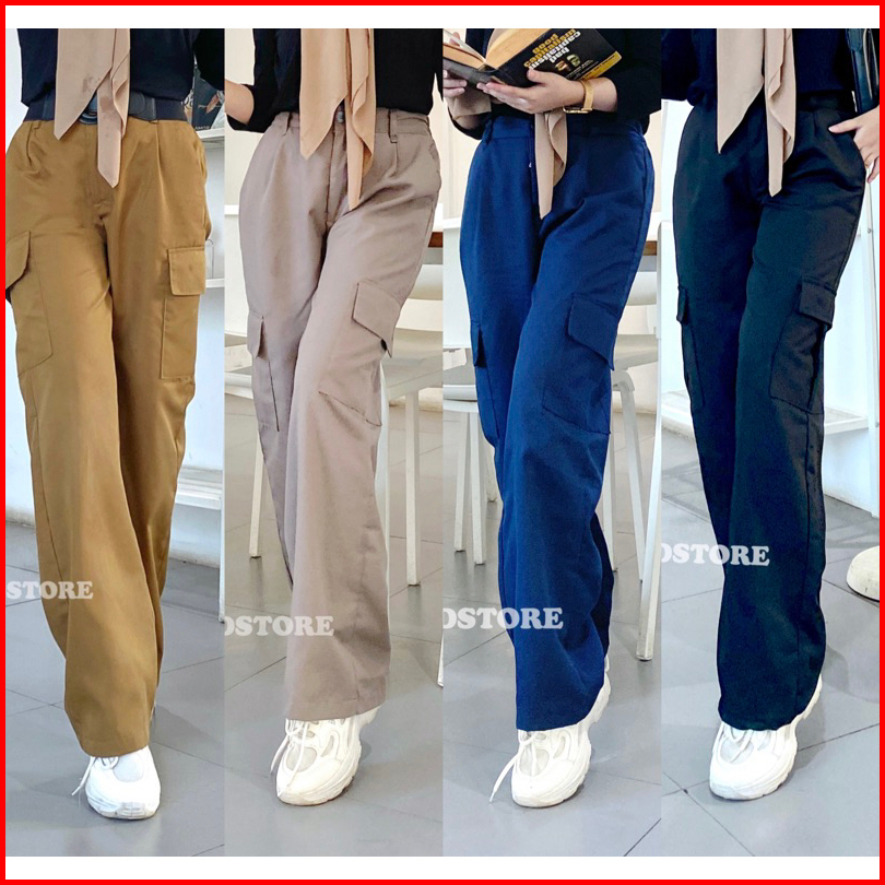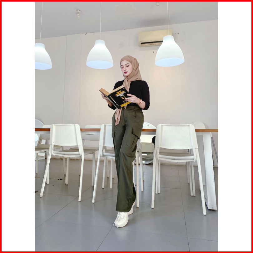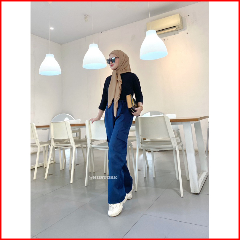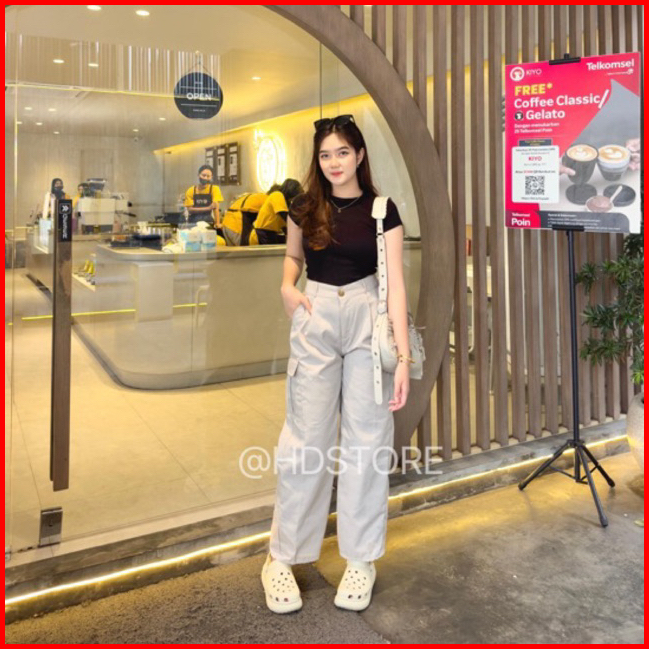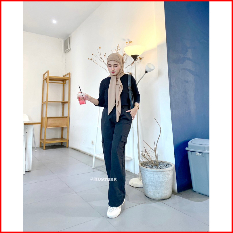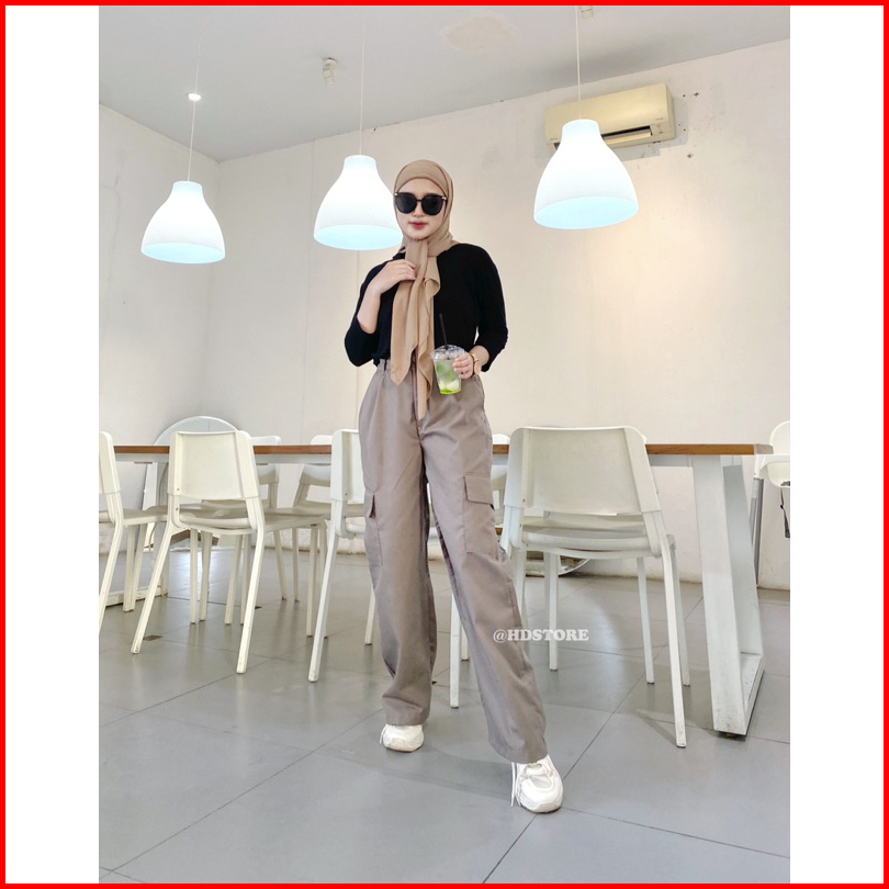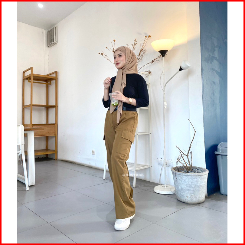 Celana Cargo Wanita Highwaist Kulot Pants Bahan Katun Drill