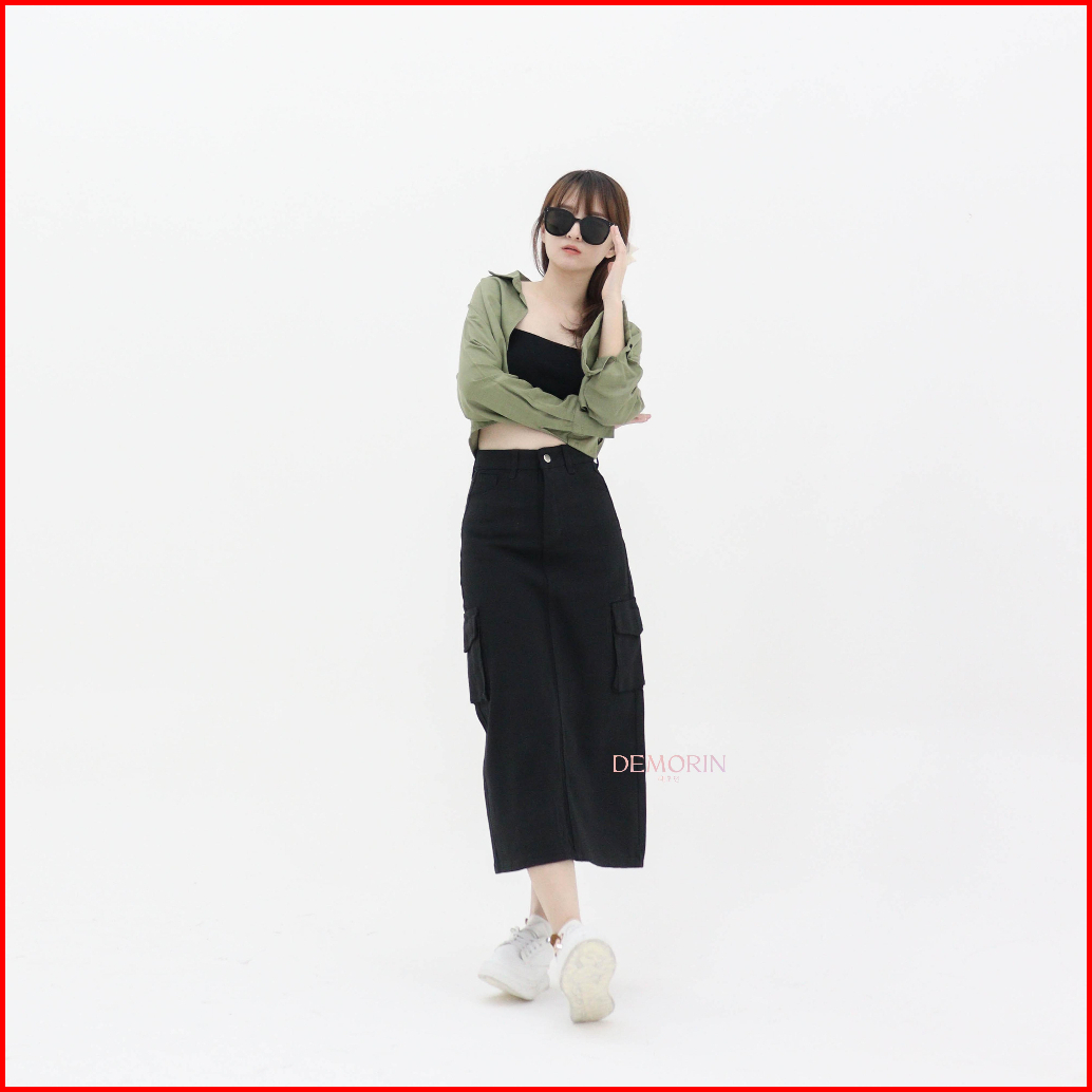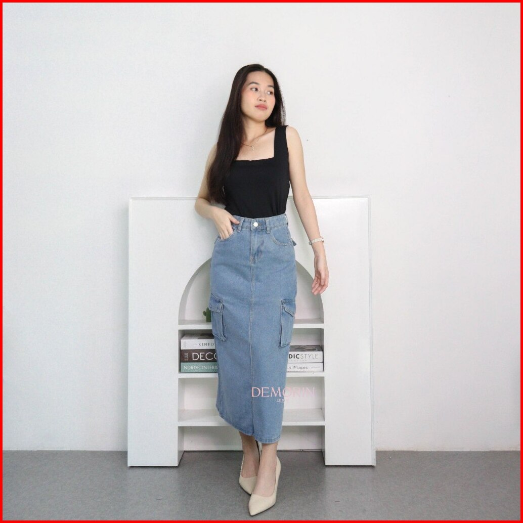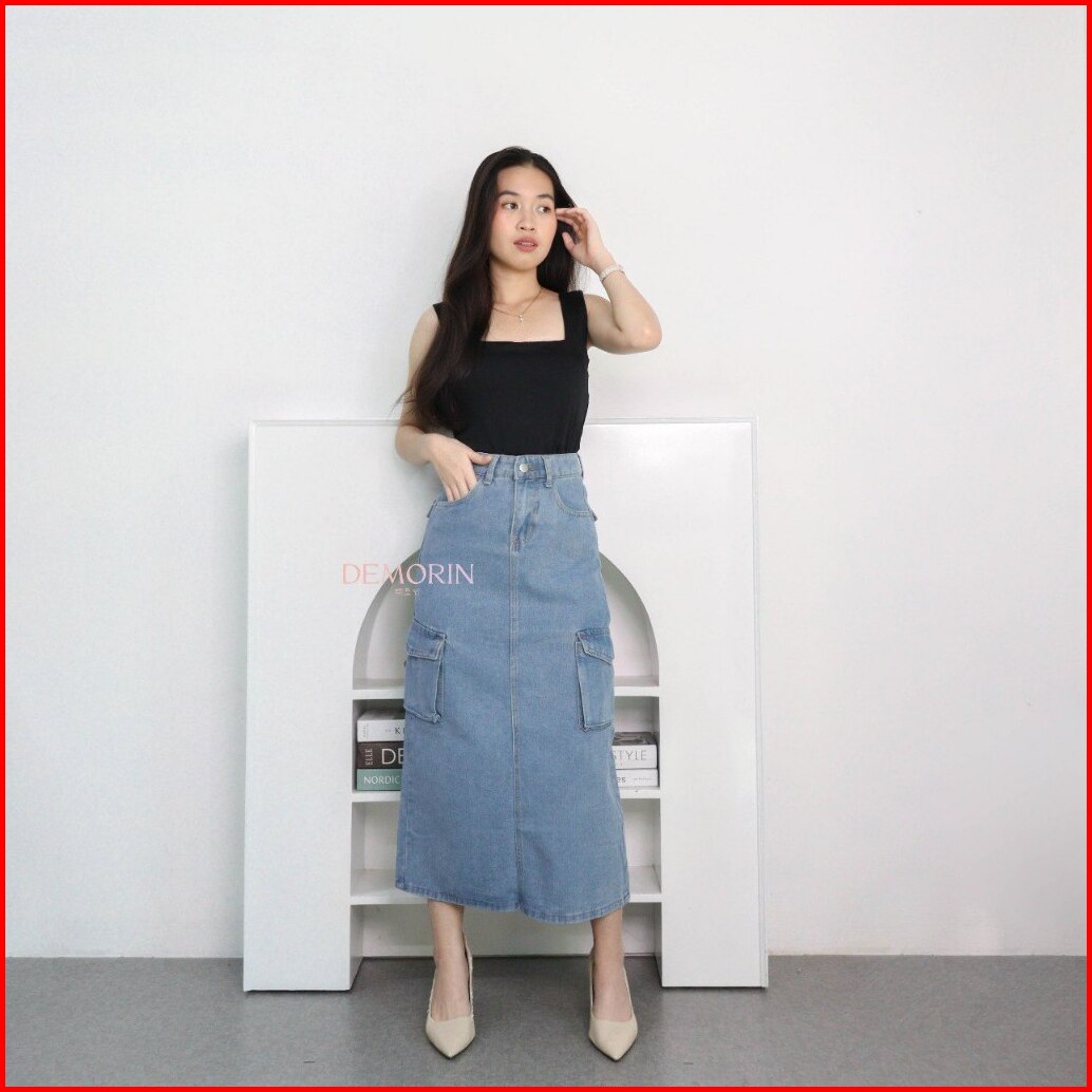 Demorin Midi Skirt Rok Jeans Wanita High Waist Rok Korea Jeans X10