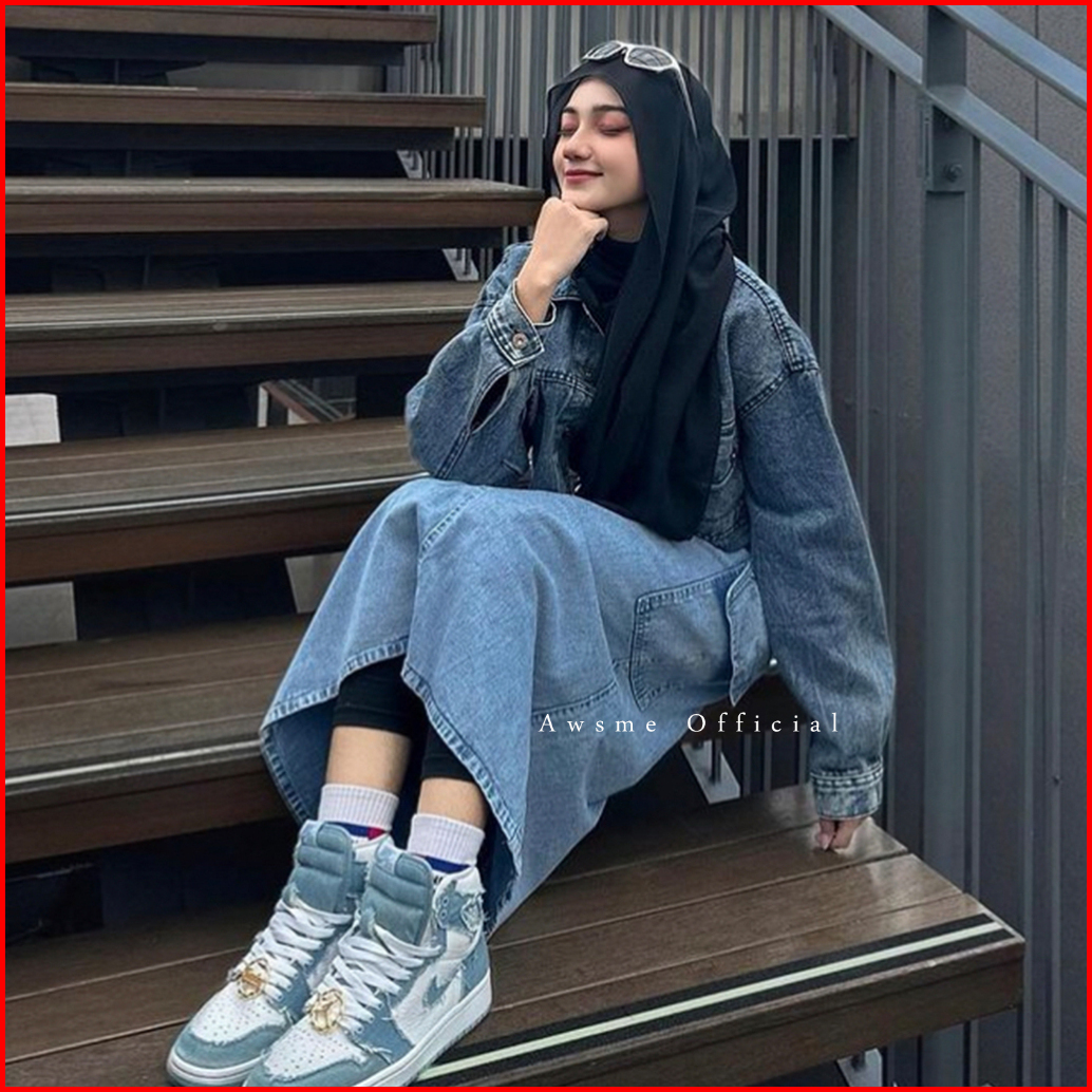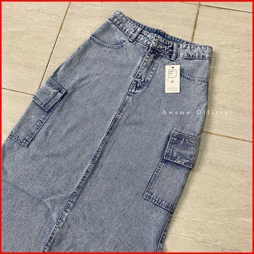 Awsme - Rok Cargo Jeans Snowblue Celana Wanita Denim Highwaist Midi Skirt Snowacid