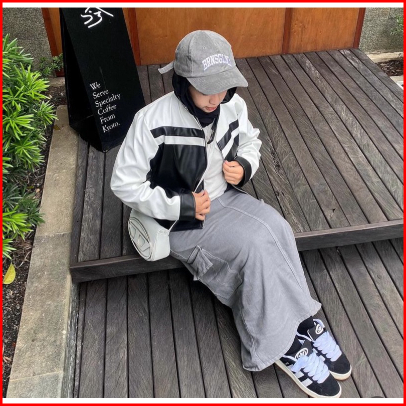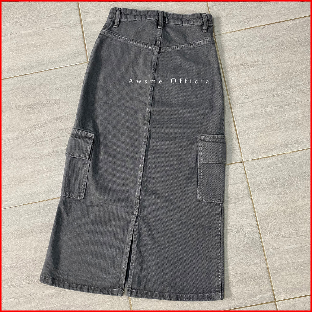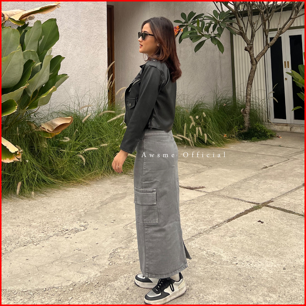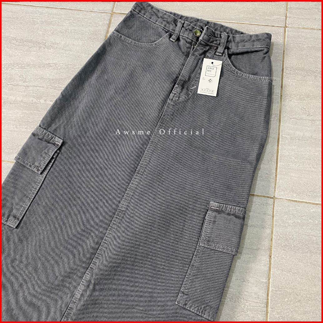 Awsme - Rok Cargo Jeans Abu Celana Wanita Highwaist Midi Skirt Grey Korean