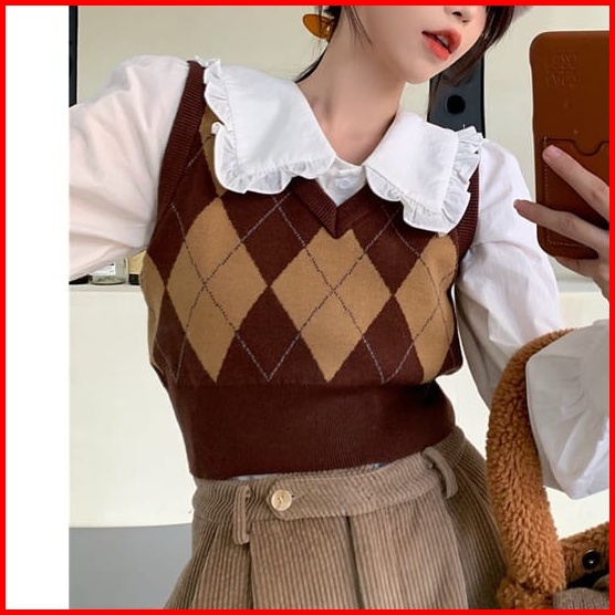 Aera Korean Diamond Plaid Knit Vest Crop Top Rompi Rajut Korea