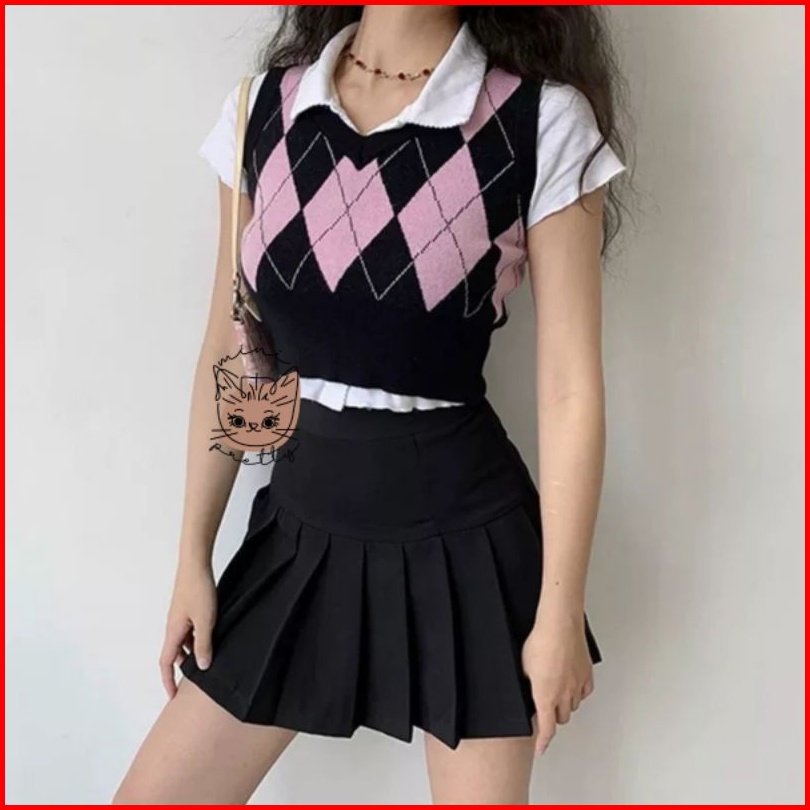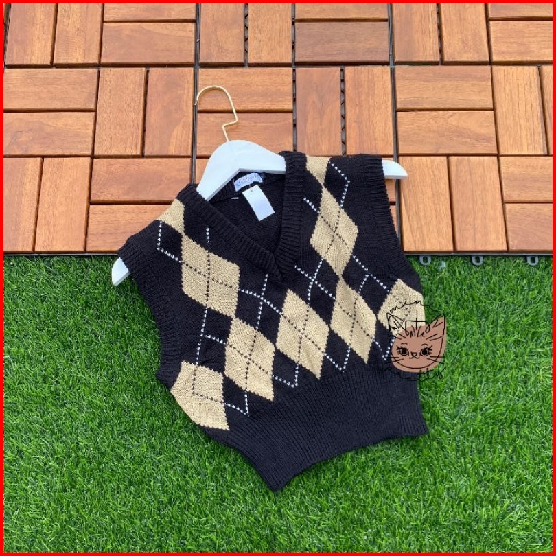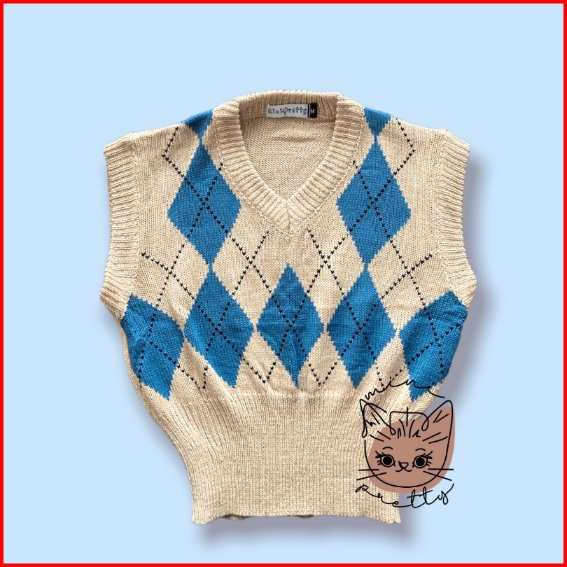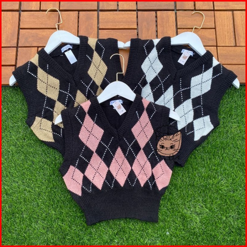 Rompi Rajut Crop Rose Blackpink Argyle Vest Knitted
