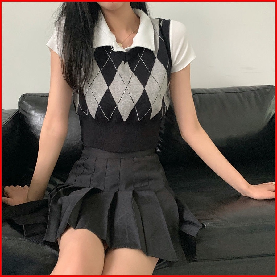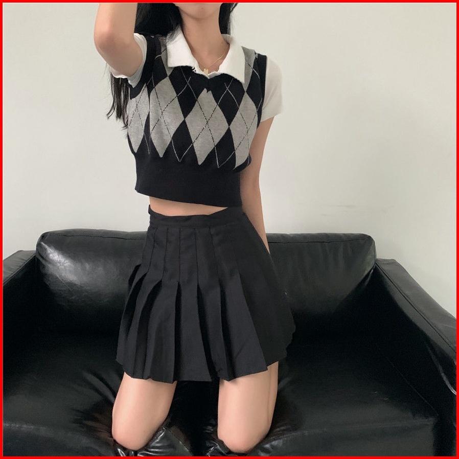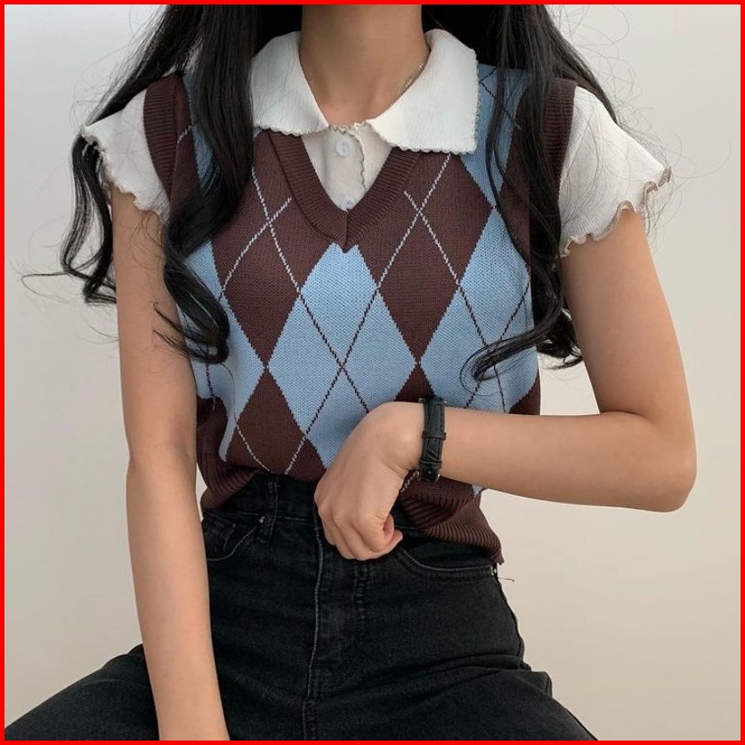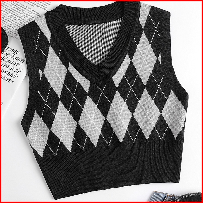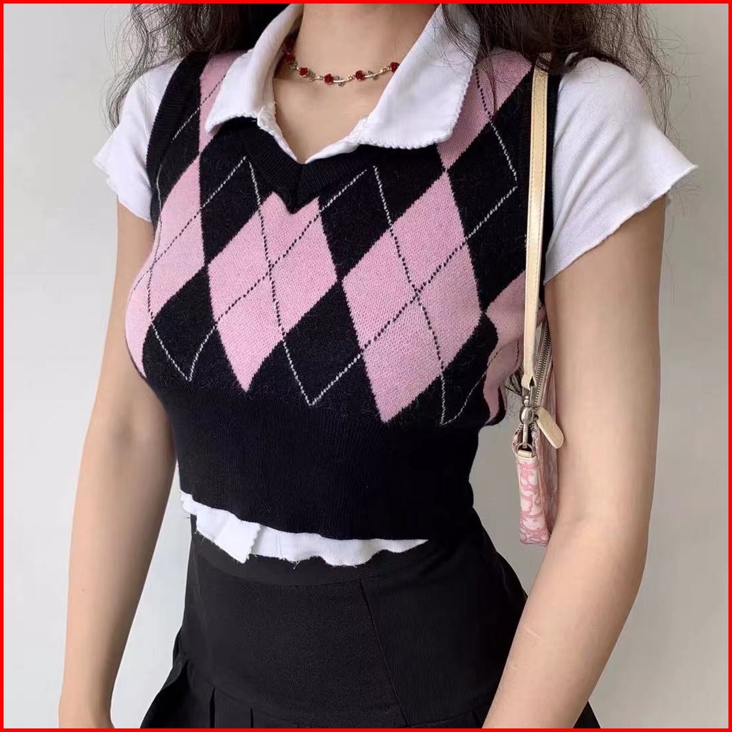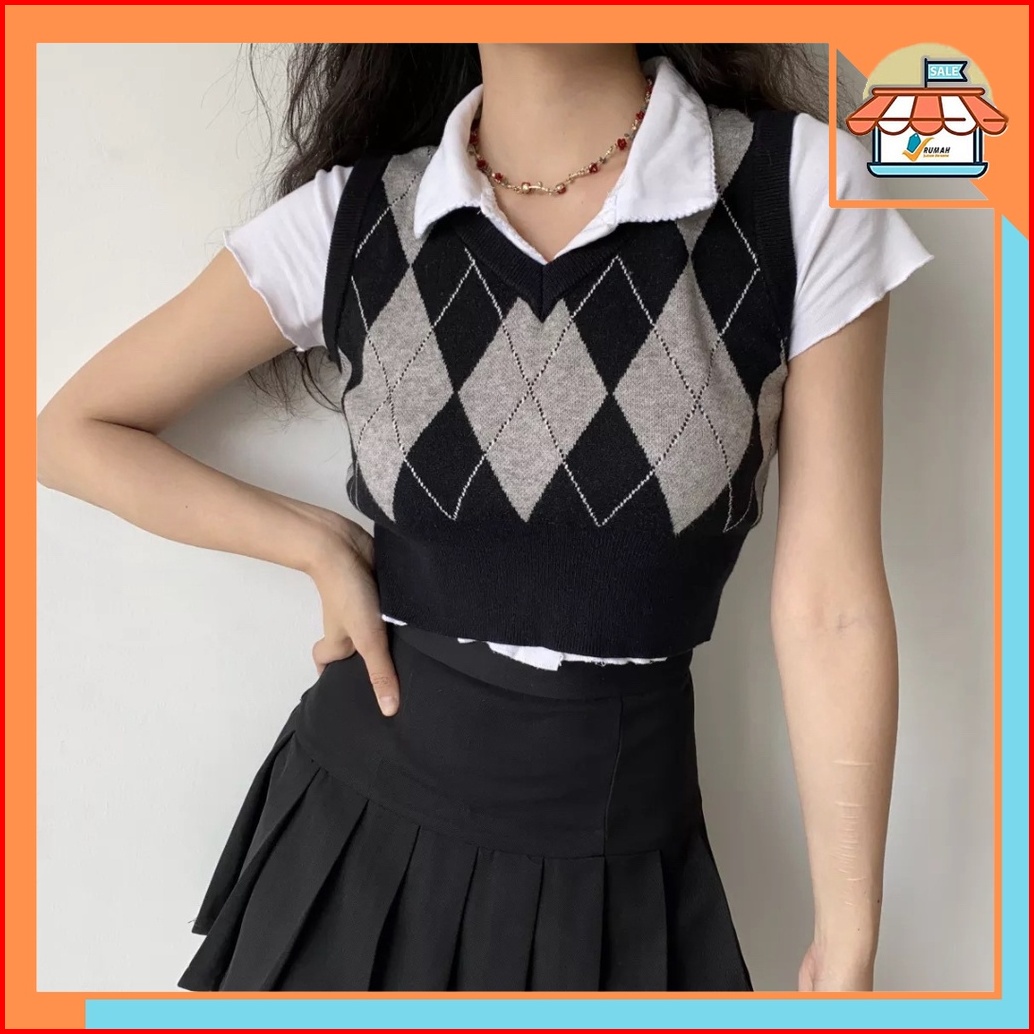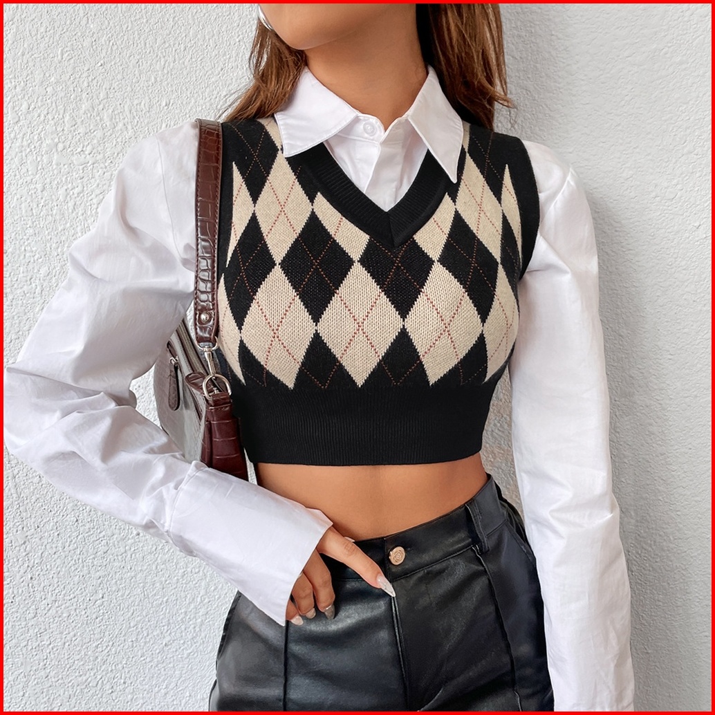 Rsb Bj373 Rompi Rajut Wanita Korean Style Fashion Retro Kotak-kotak V-neck Crop Top