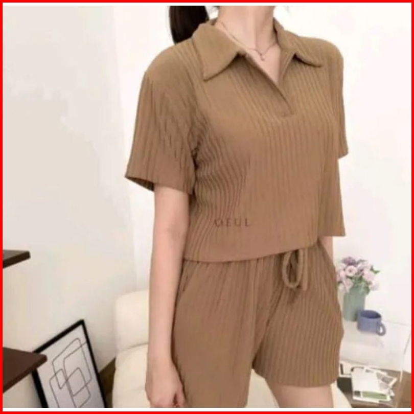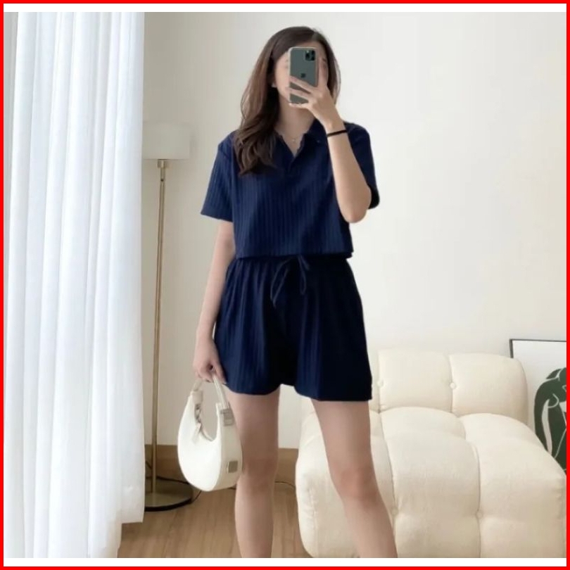 Setelan Baju Wanita Homy Set One Set Hot Pants Crop Top Knit Hornet