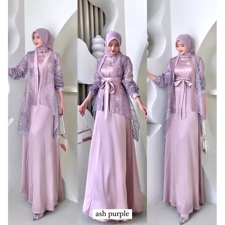 Dress Inner Outer Kimino Satu Set Wanita Gamis Muslim Brokat Tile Bordir Motif Kondangan Bridesmaid Wisuda Brokat
