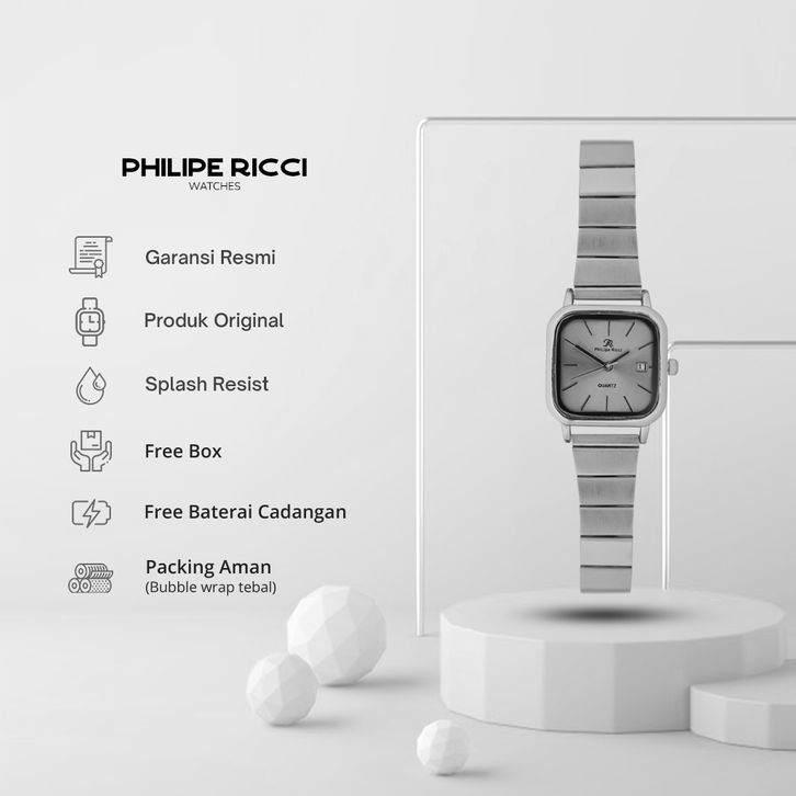 Jam Tangan Wanita Kecil Philipe Ricci Analog Original Tali Rantai Stainless Steel Dial Kotak Simpel Modern 6450