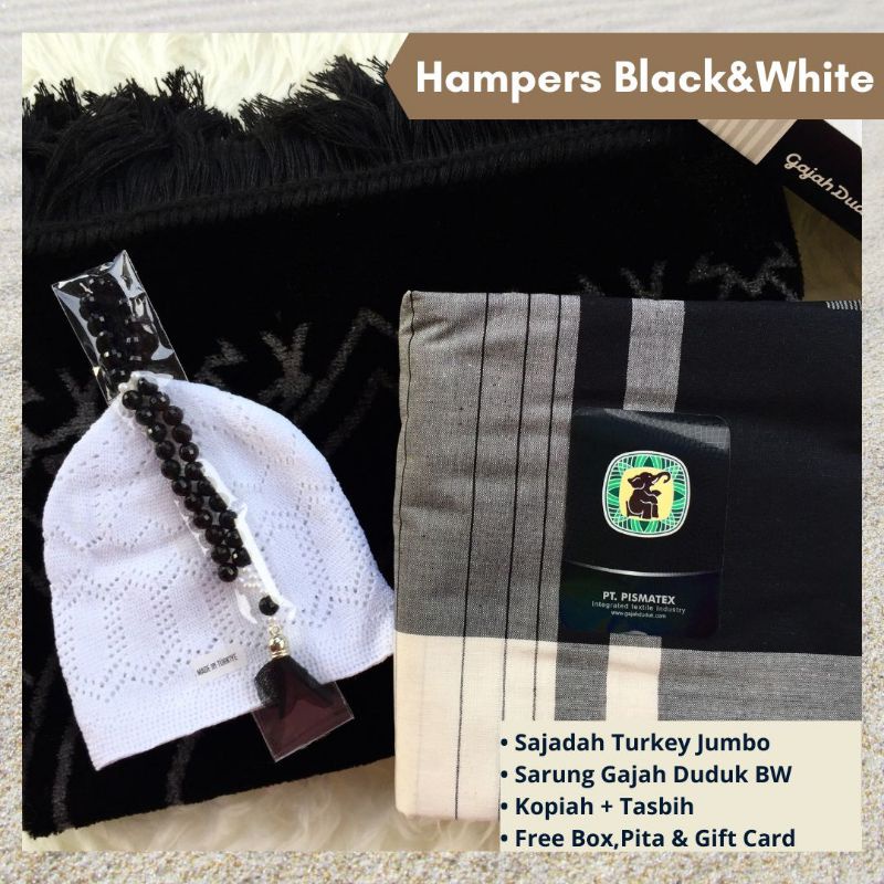 HAMPERS BLACK AND WHITE KADO COWOK ULANG TAHUN SAJADAH TURKI GAJAH DUDUK