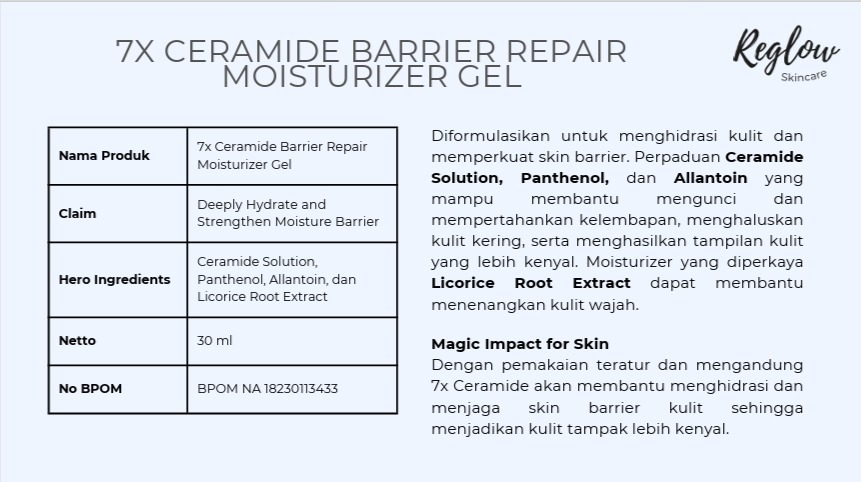 Reglow Skin Barrier Cream 7X Ceremide Repair Moisturizer Gel Bpom