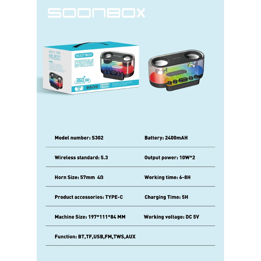 SOONBOX S302 Speaker Bluetooth 5.3 Portabel 20W Suara 360° LED Light Bass Sound + Mechanical Button