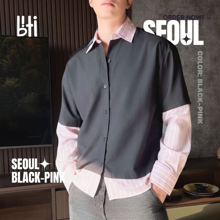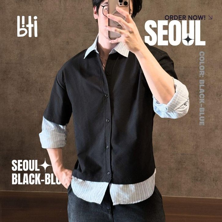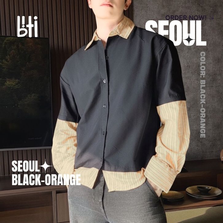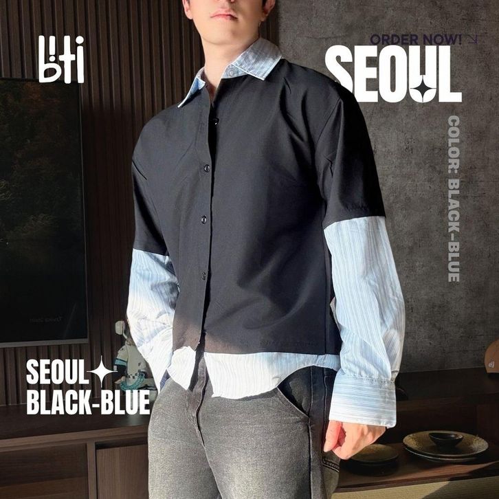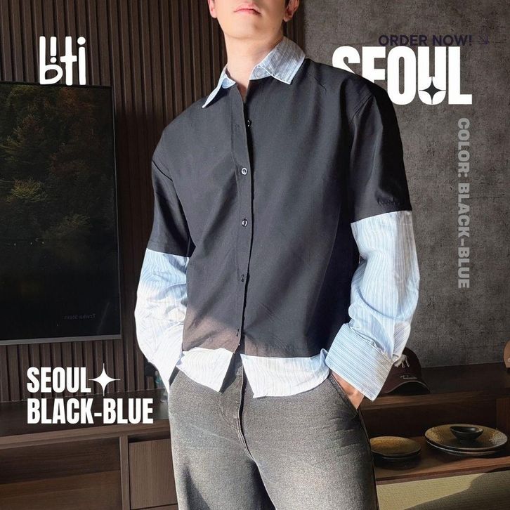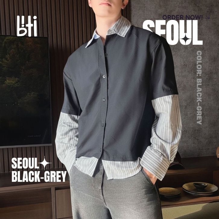 BITI Seoul Shirt | Kemeja Layer 2 in 1 Lengan Panjang Pria Hitam Garis