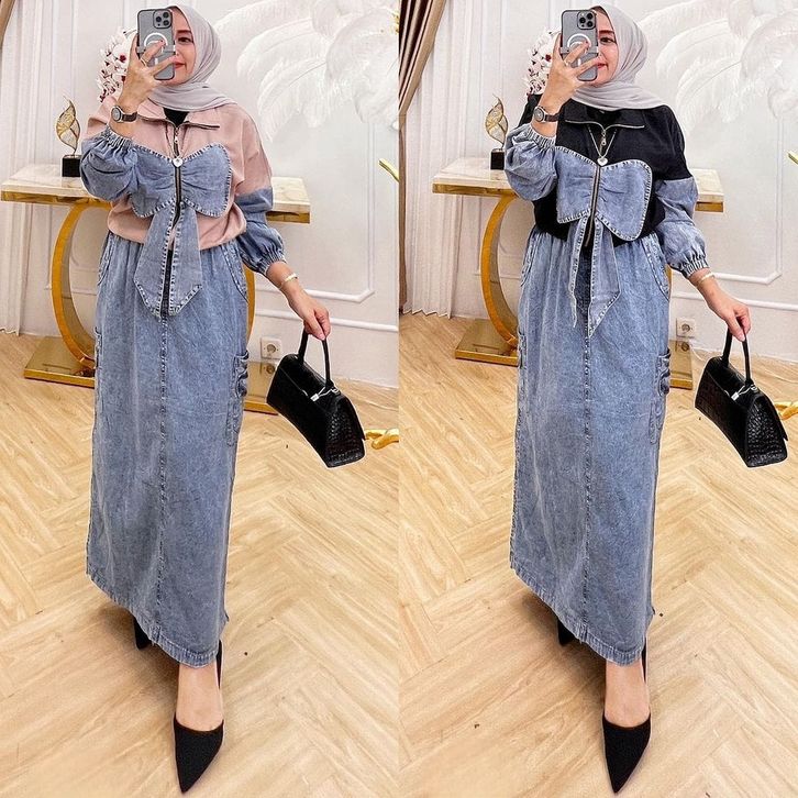 One Set Wanita Muslim Set Rok Modern All Size Fashion Pakaian Simpel Kasual Matterial Toyobo Mix Jeans Premium Nyaman