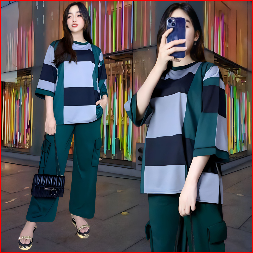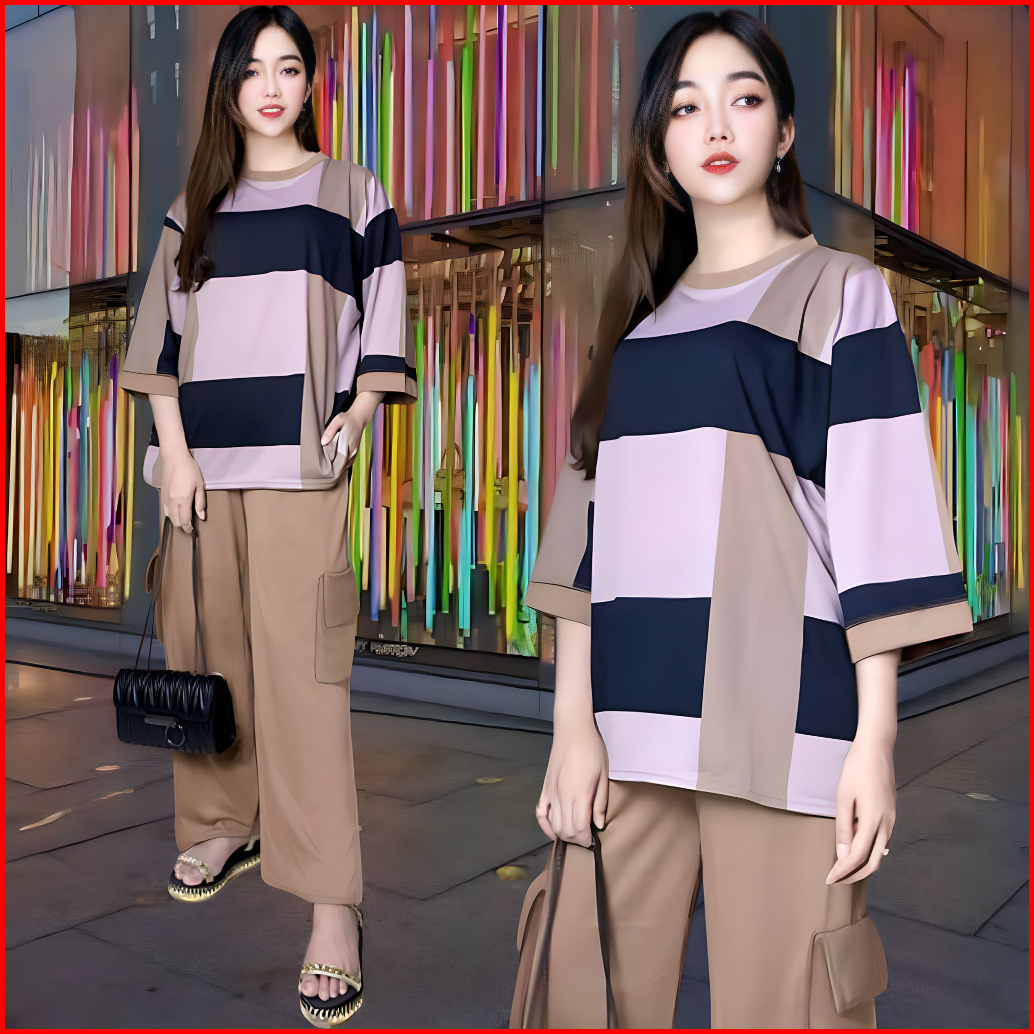 Faustina Ld 120 Setelan Vistaterry Wanita Celana Cargo Dan Atasan Oversize Wanita Baju Kantong Kulot Karet Kaos Santai M
