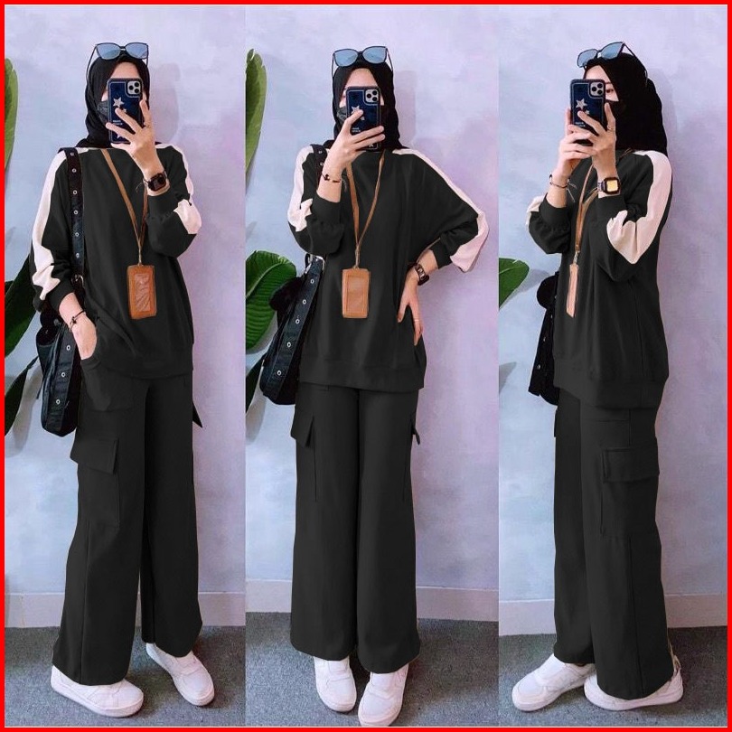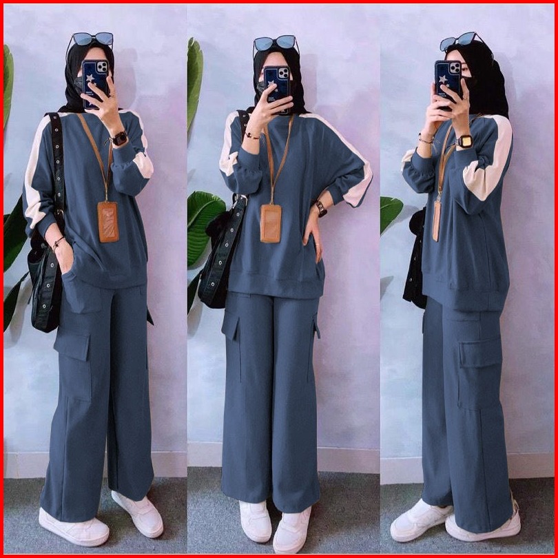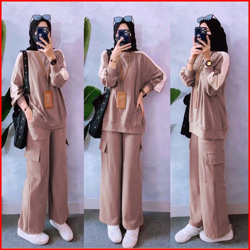 Larra One Set Sweater Celana Cargo Bahan Waffle Knit Setelan Wanita Oversize Korean Style Kekinian
