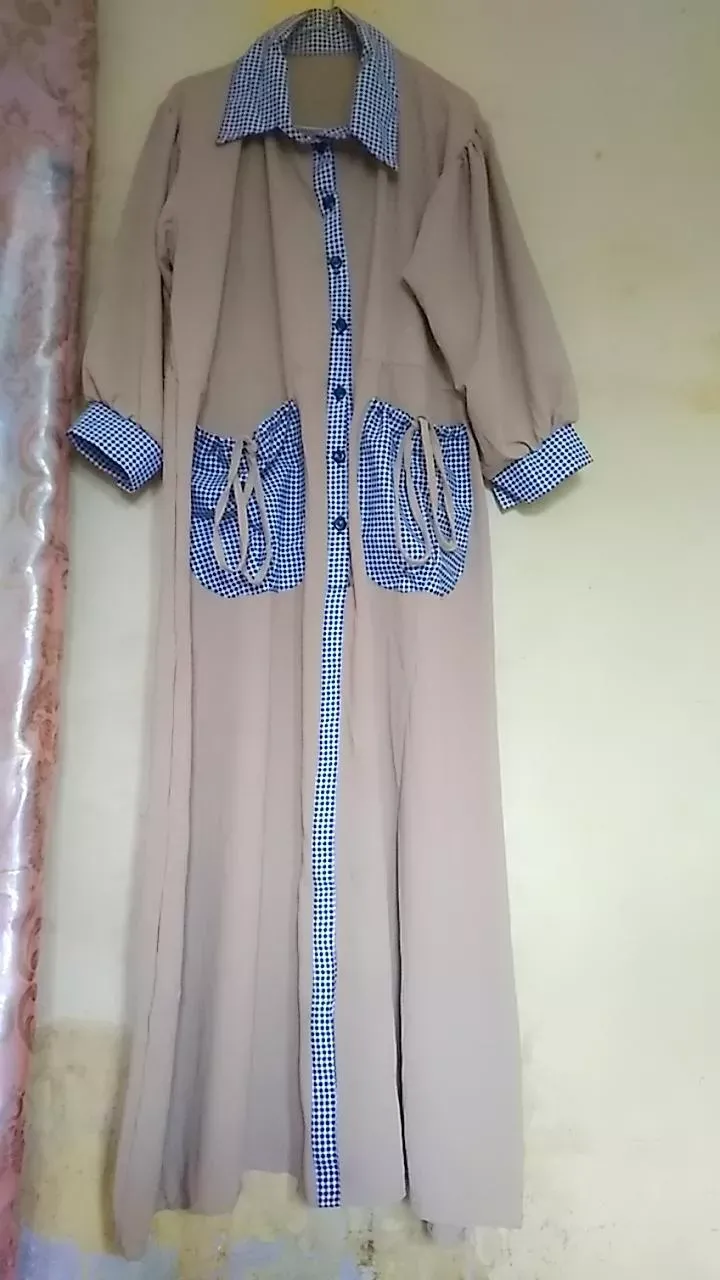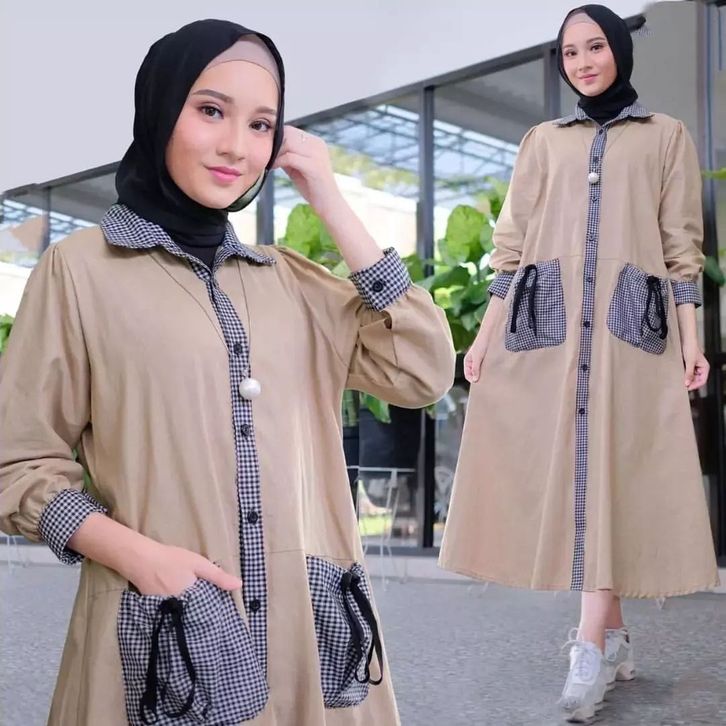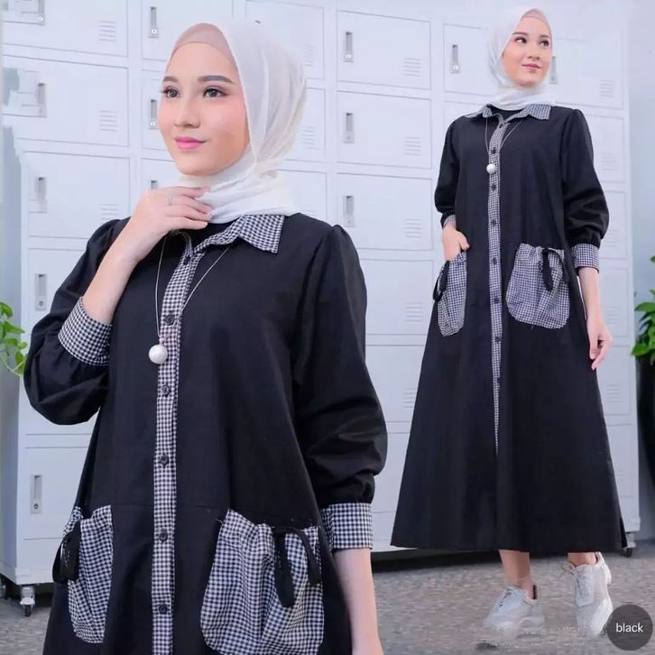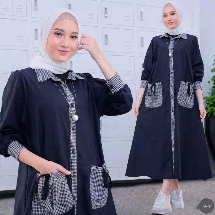 Midi Dress Cantik Gamis Wanita Motif Kotak Fashion Pakaian Kasual Busui Friendly Matterial Crinkle Mix Katun Kekinian