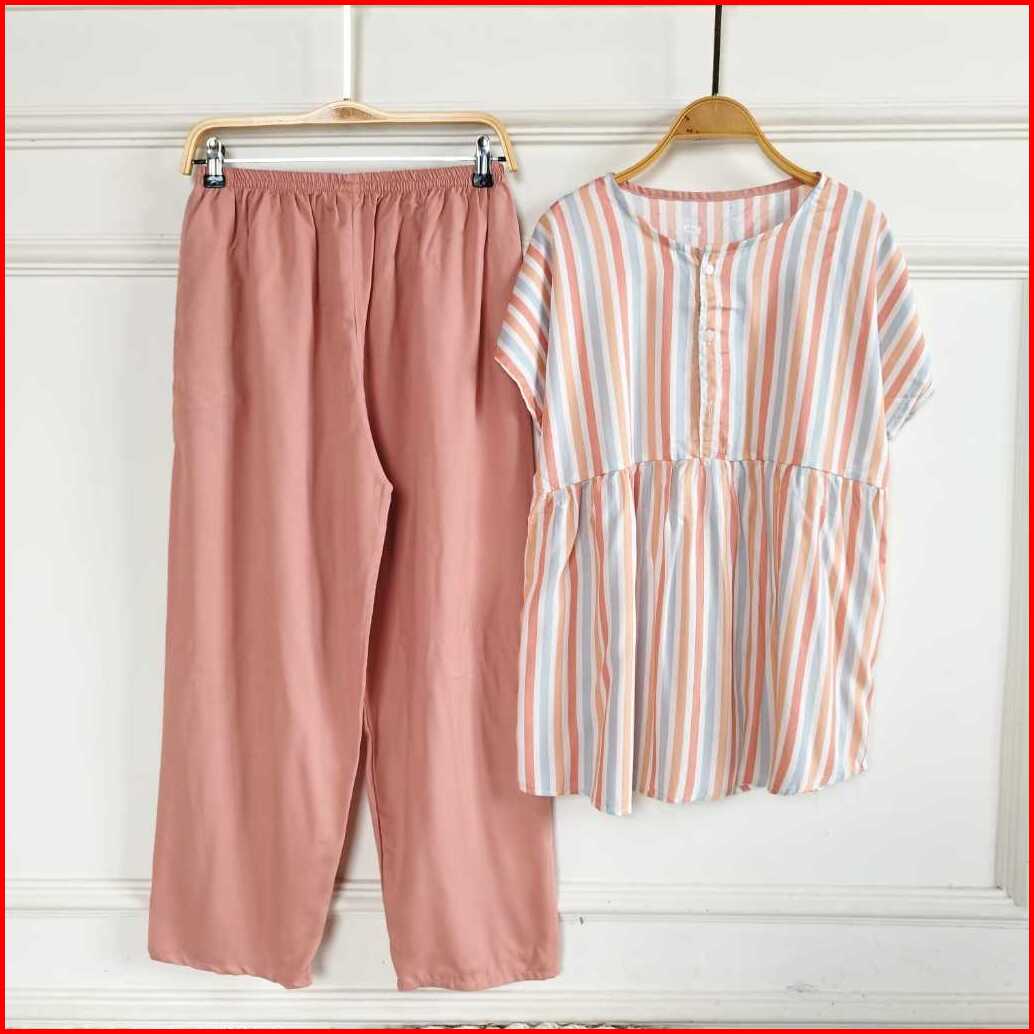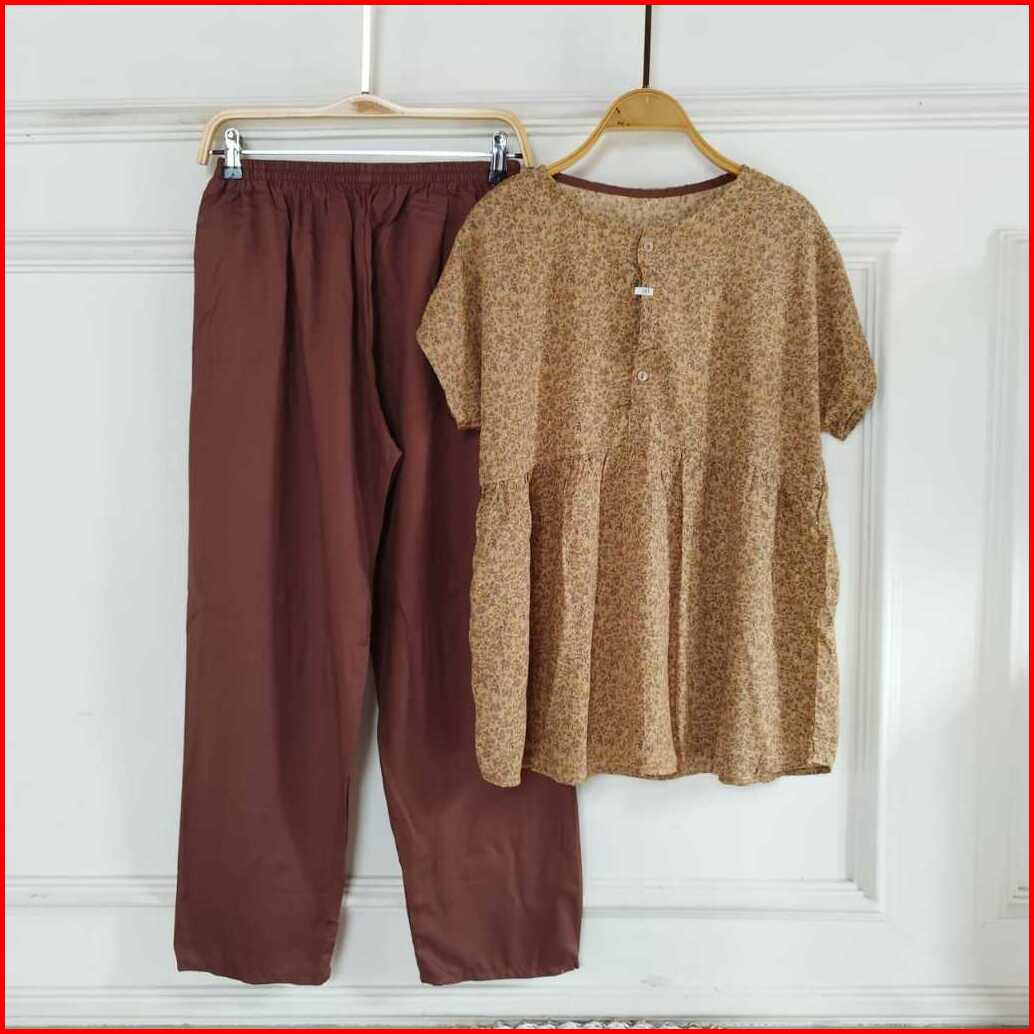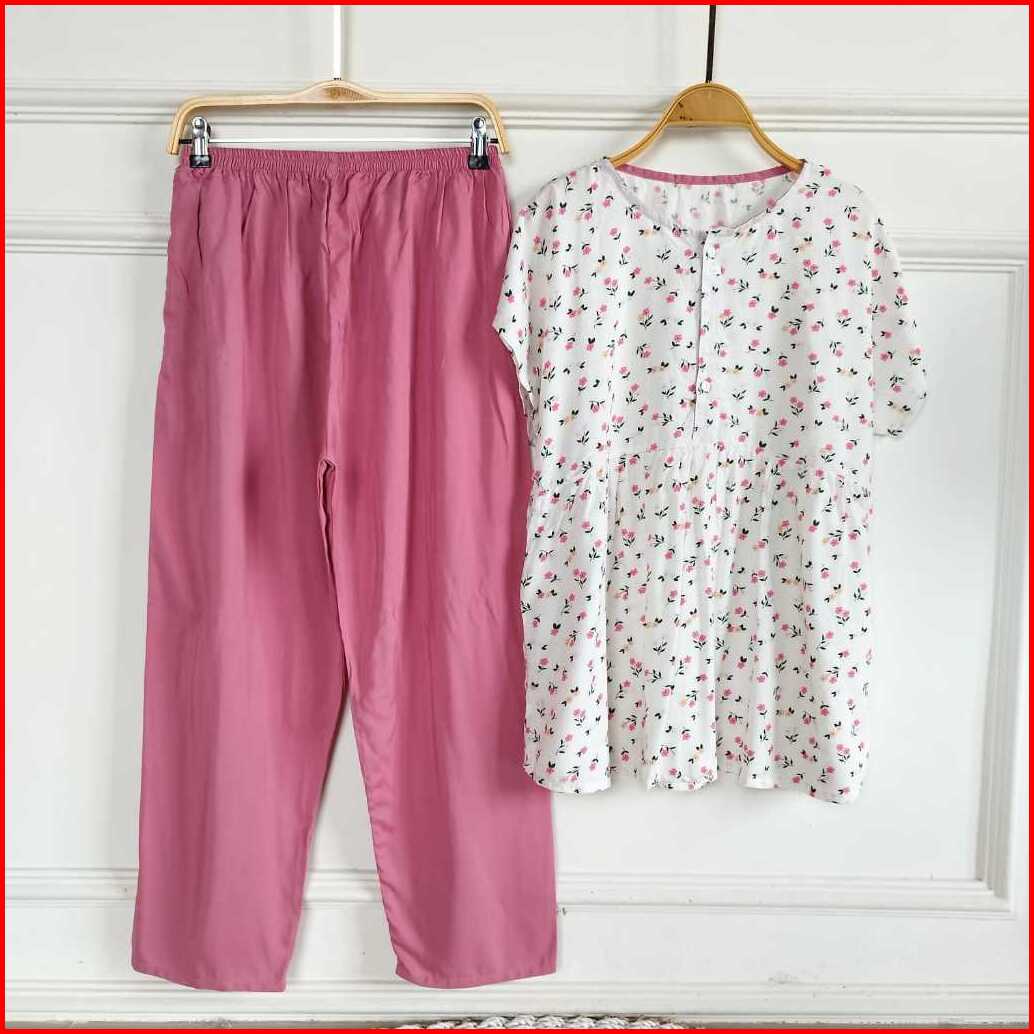 Setelan Busui Ruffle Babydol Rayon Kancing Pajamas Ruffle Lengan Pendek Celana Panjang Baju Murah Wanita