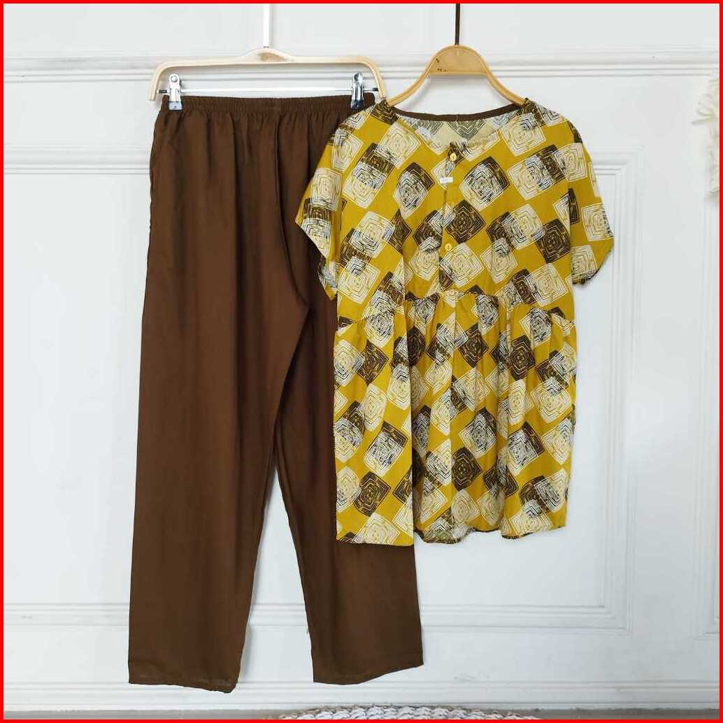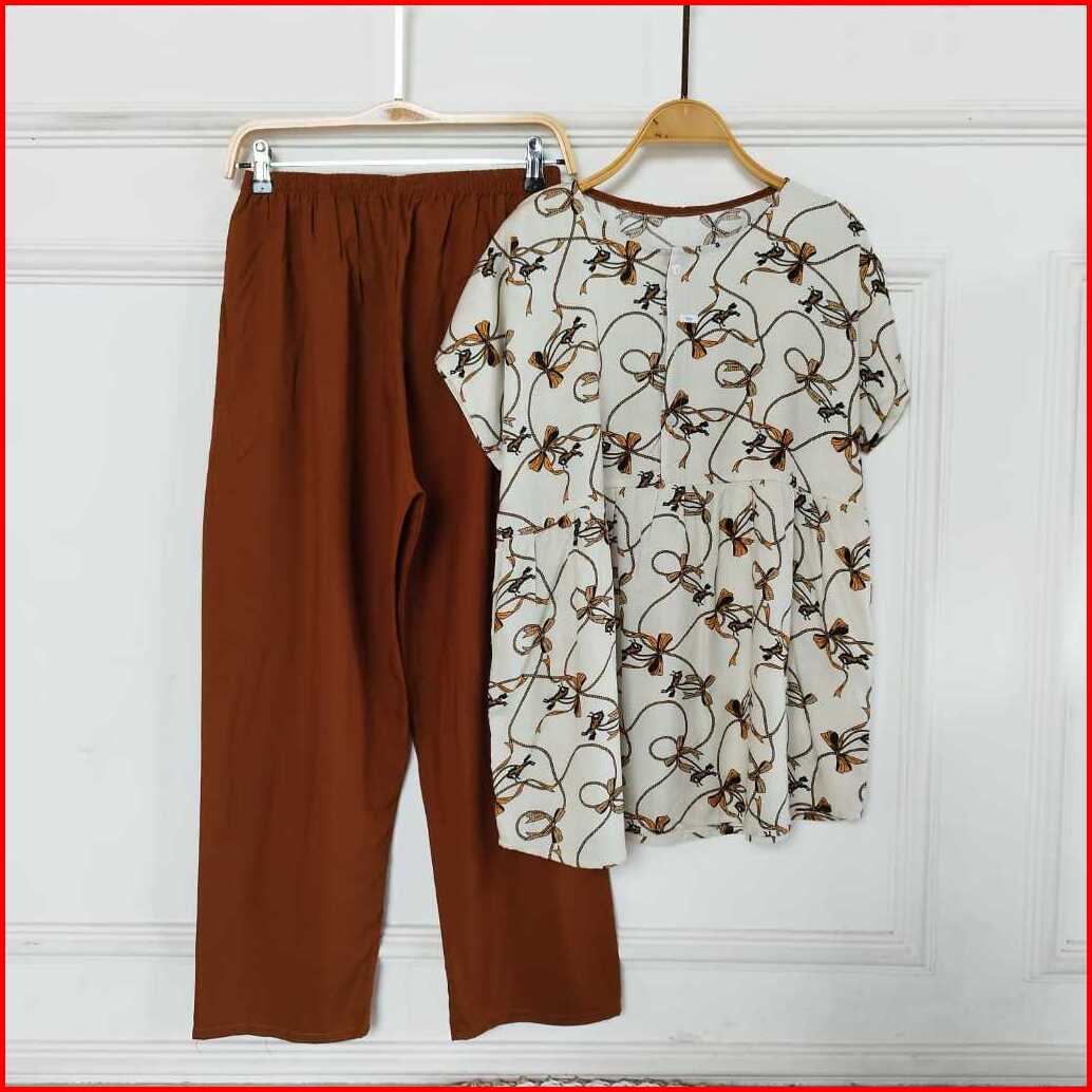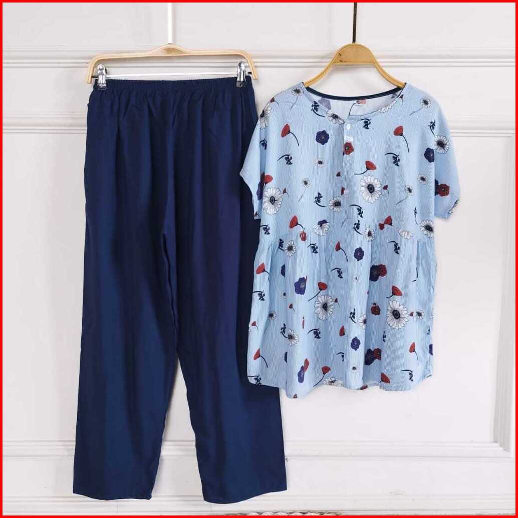 Setelan Busui Ruffle Babydol Rayon Kancing Pajamas Ruffle Lengan Pendek Celana Panjang Baju Murah Wanita
