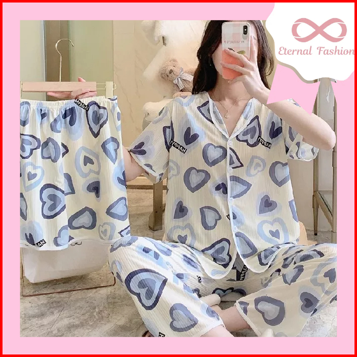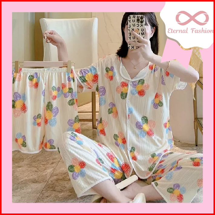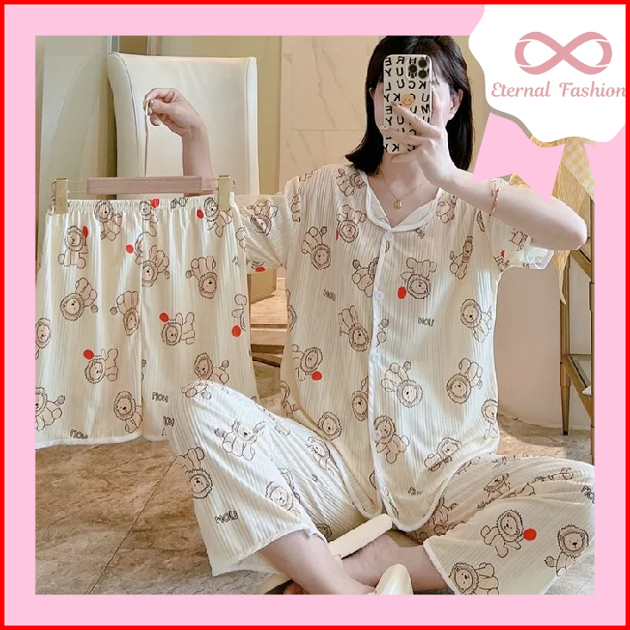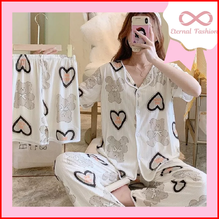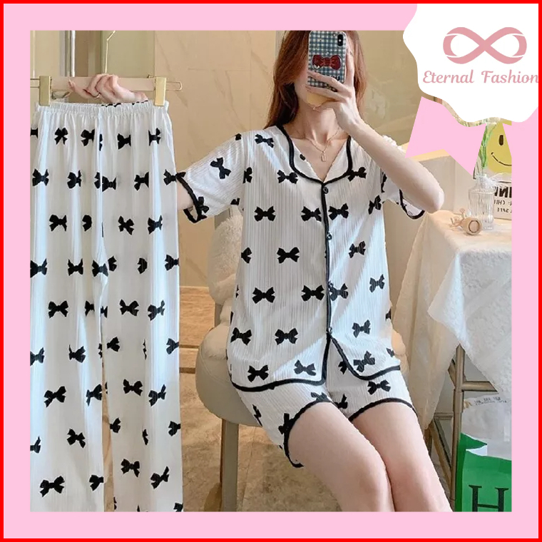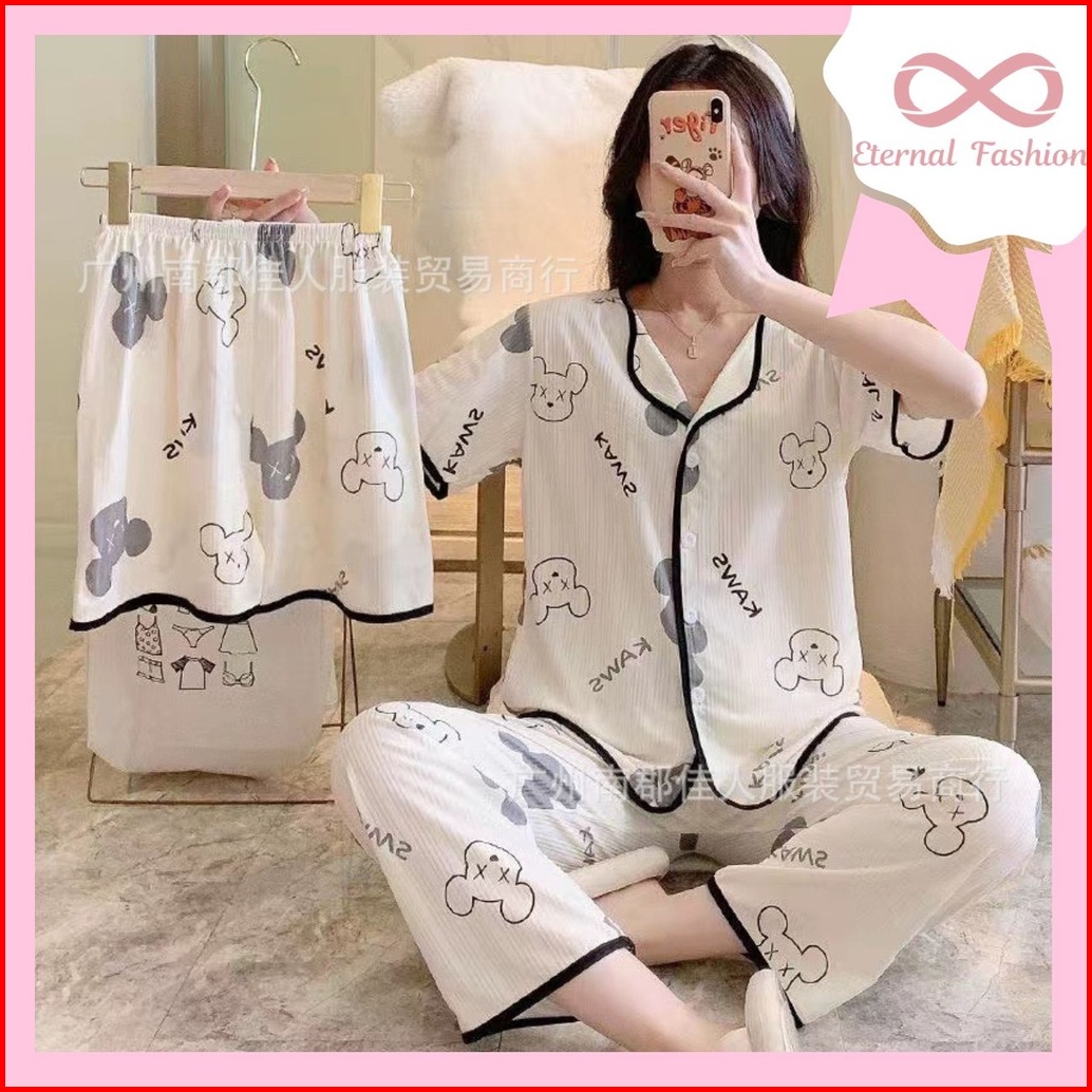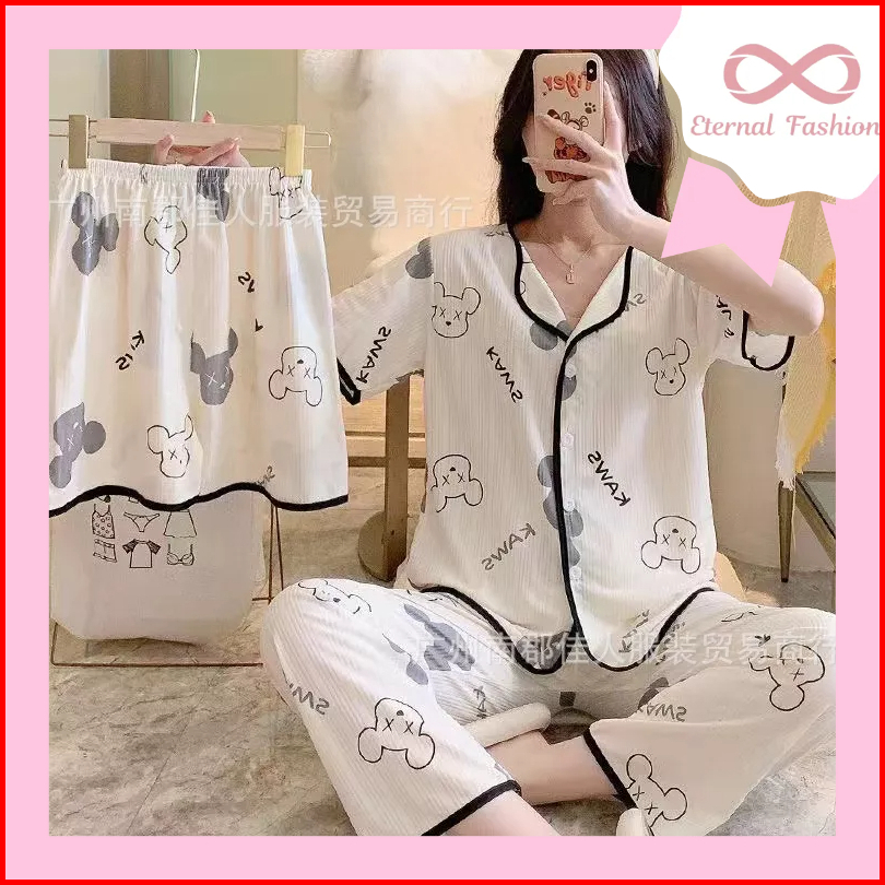 Baju Tidur Wanita Motif Import 3 In 1 Pajamas Wanita Celana Panjang Free Celana Pendek Piyama Wanita Dua Celana Baju Tid