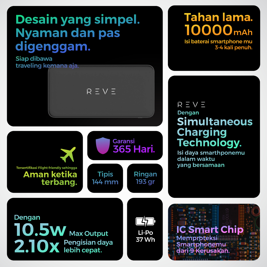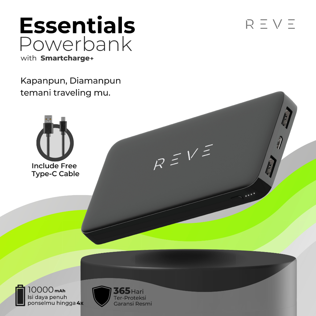 Reve 10000mAh Powerbank Max Output with Dual Output USB + Type-C Output, 10000mAh Triple Output PB