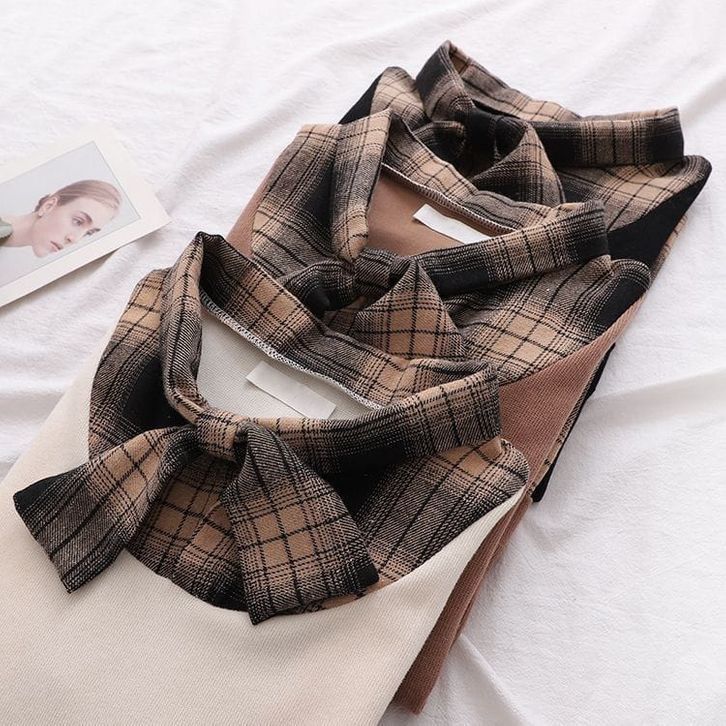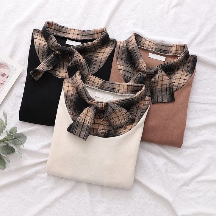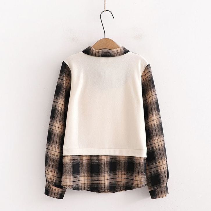 Atasan Oufit Kemeja Top Flanel Fashion Pakaian Blouse Long Sleeve Mock Two Piece Plaid Shirt Outfit Kasual Bahan Terry