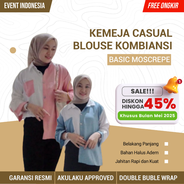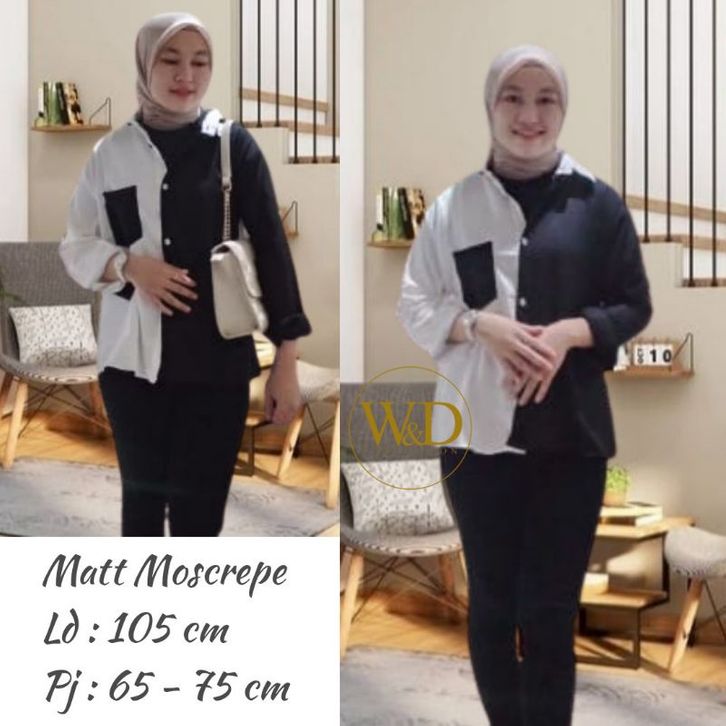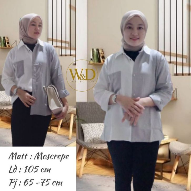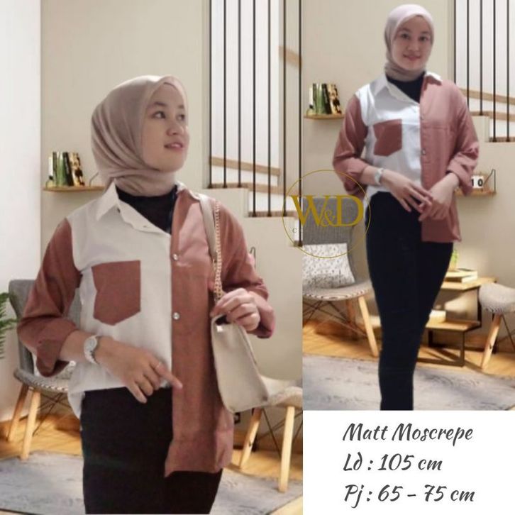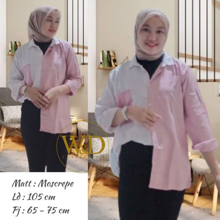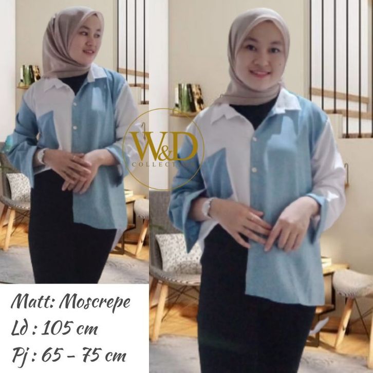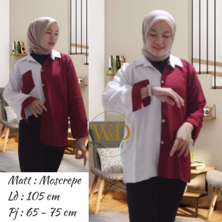 Kemeja Cewek Polos Casual Blouse Basic Perempuan Kombinasi Warna Lengan Panjang Kekinian Moscrepe Fashion Cewek