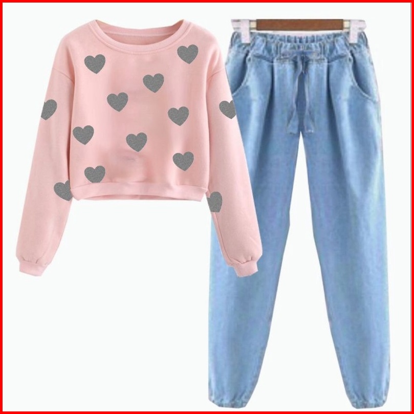 Setelan Sweater Anak Remaja Perempuan Love Celana Joger Soft Jeans
