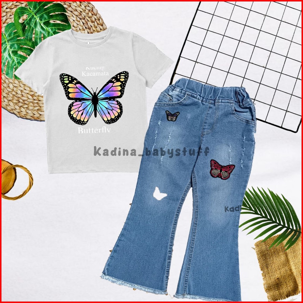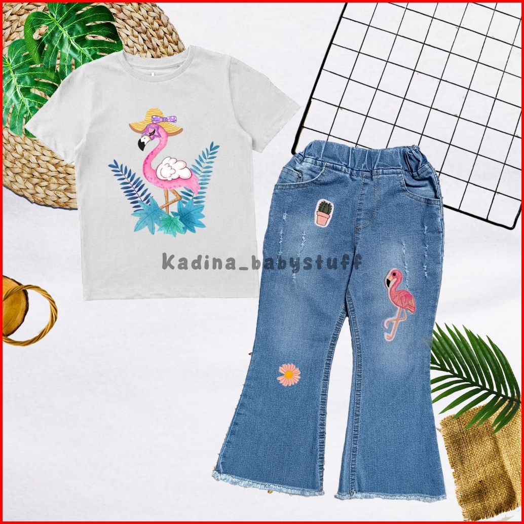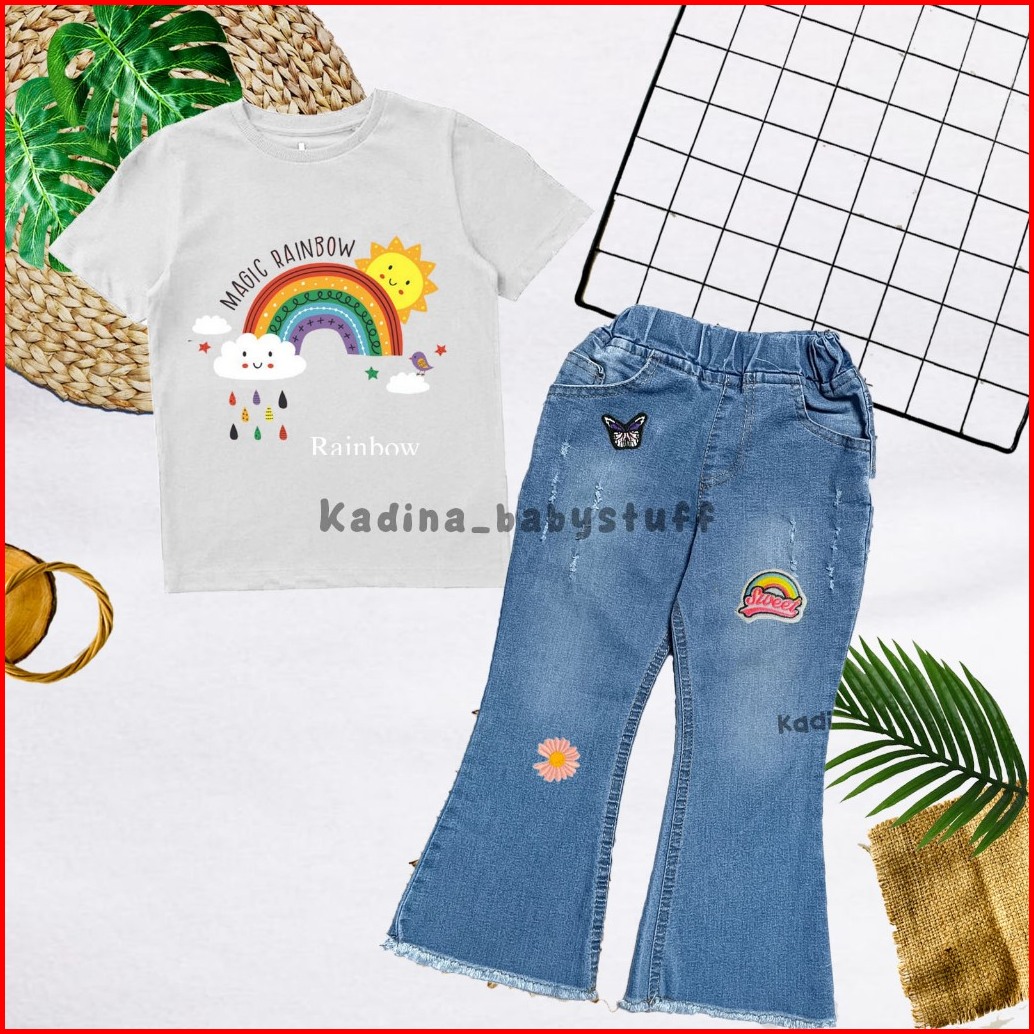 Terbaru Setelan Jeans Anak Perempuan Celana Cutbray Bordir Unicorn Flamingo Rainbow Kaos Motif Sablon Anak Usia 1-10 Tah